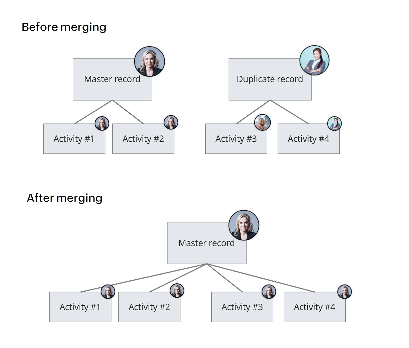 CRM automatically merges duplicate entries if they are exact copies of each other. (*)Conflict Example: |