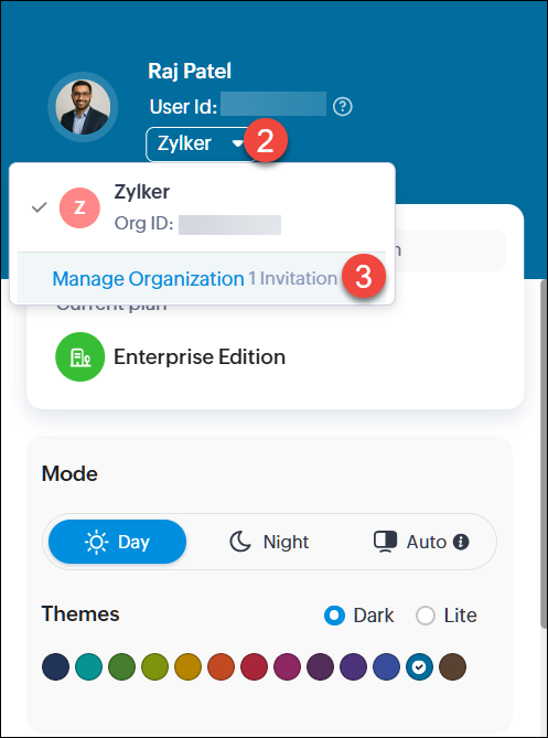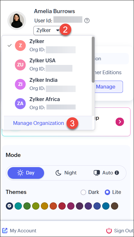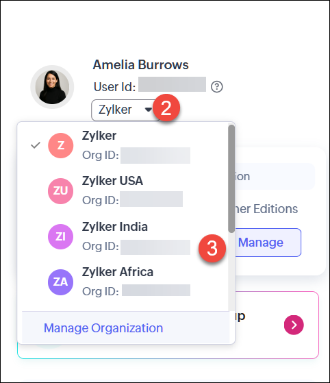 - Organization listing: The user can go to the profile icon, click the down arrow next to the org name, and click Manage Organization.