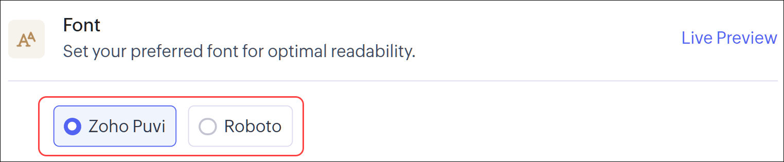 Note: This is currently fully supported on the home page, custom view, and standard record views (detail, create, edit, clone).Users can pick a font family that suits their preference. The selected font will be applied across the CRM interface. The options available now are: