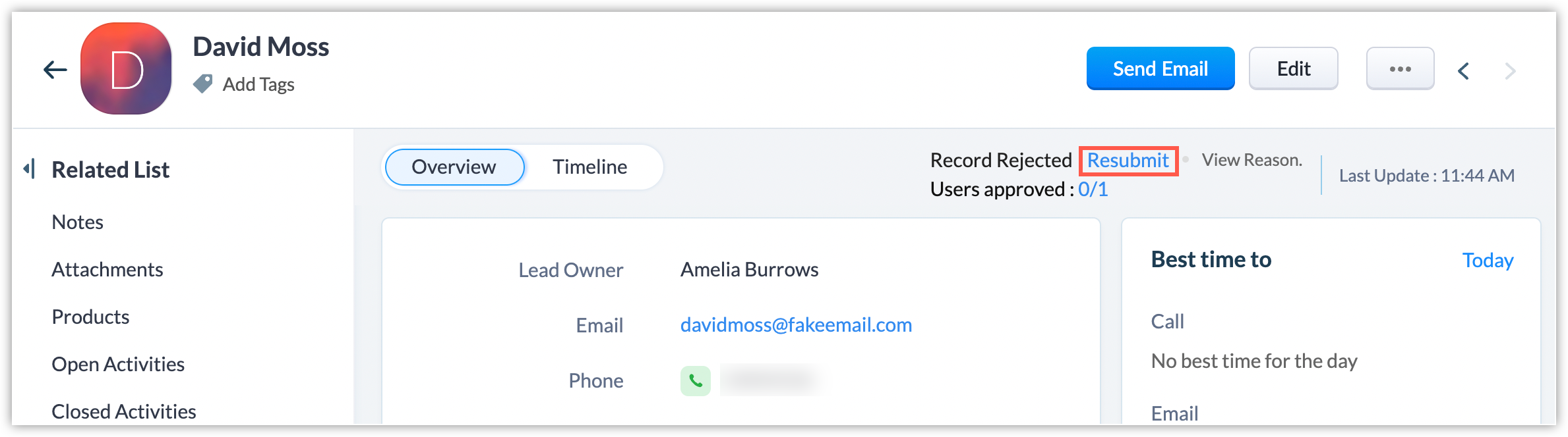 Upon rejection, a record can be submitted for re-approval within 180 days of rejection by clicking the Resubmit option from the records detail page.