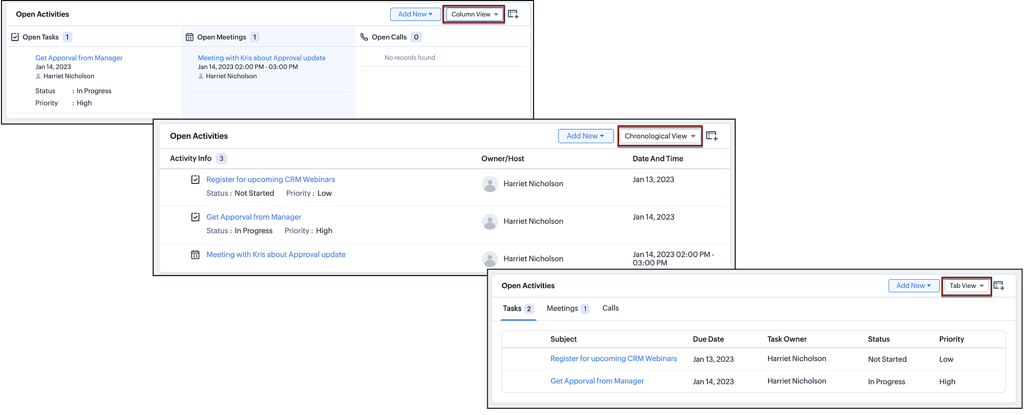 Within each record, the upcoming activities are displayed as open activities and the completed ones as closed activities. To gain a perspective about their schedule, you can also toggle between three activity views in a related list: column view, chronological view, and tab view.