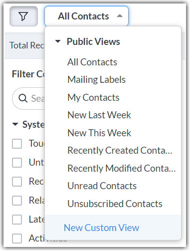 • The records are displayed in List Views. Define your own Custom Views  as per your requirements. Some system defined list views are already available, such as My Contacts, New This Week, New Last Week, Unread Contacts, etc.