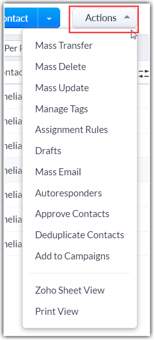 • Click on the Action button in the detail page to perform some common operations to manage contacts. For example: mass transfer, mass delete, export contacts, etc.