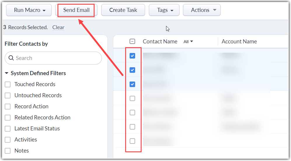 • Mass email the contacts by selecting the check boxes corresponding to the records and clicking on the Send Mail button.