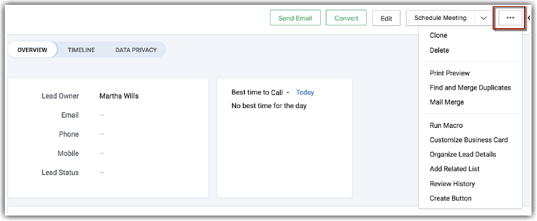 You can access more lead options by clicking on the More icon in the Lead's Details page.