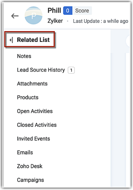 - In the Lead's details page, under Related List section, click on the required related list name to navigate to the corresponding section.