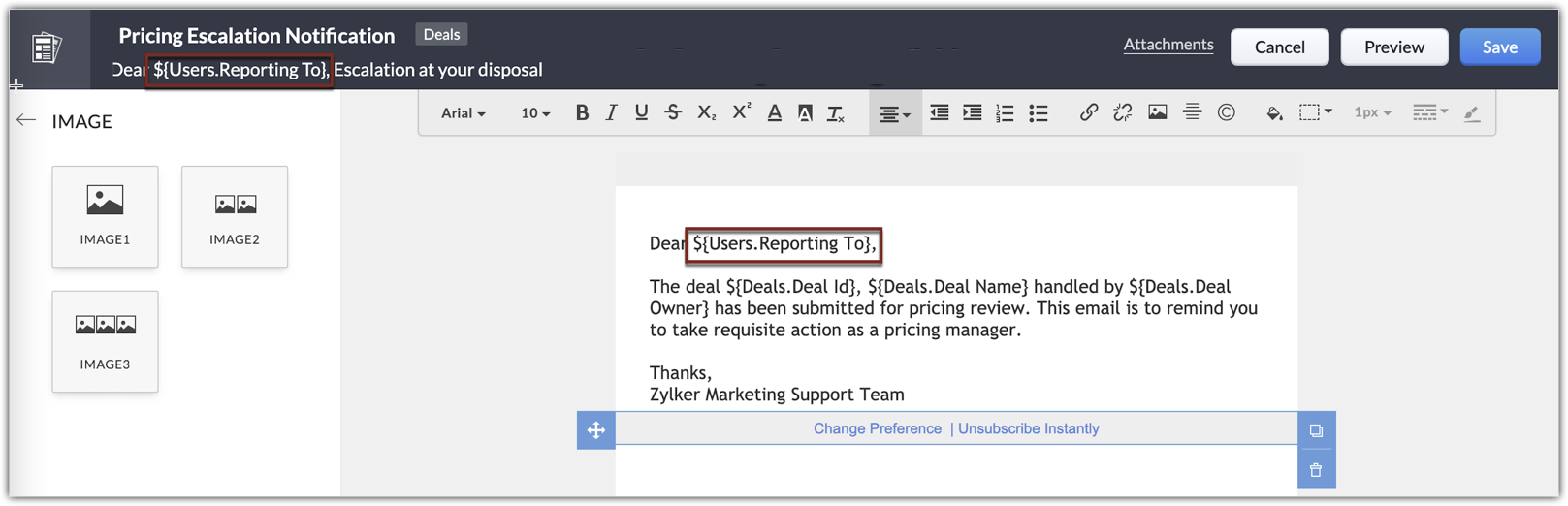 Zoho CRM lets you create sets of actions that help you automate sales and marketing activities. You can associate these actions with workflow rules, blueprints, and approval processes. One of the actions that can be directly associated with the reporting hierarchy is sending alerts. You can associate an alert with a workflow rule, so that the selected email is automatically sent to the recipients when the rule is triggered. In the reporting hierarchy, you can choose a record owner's reporting manager as one of the email recipients.