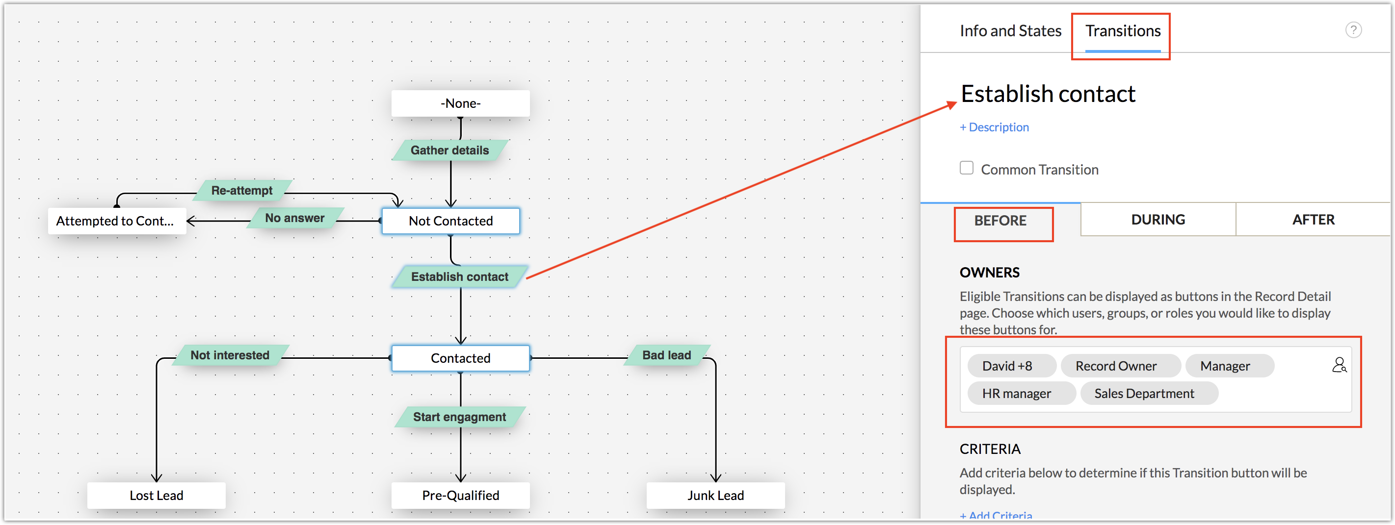 If a particular transition, which is visible to admins, is not also visible to users who have a custom profile or a particular role, or who are part of a specific department, make sure the user has been added to the Before part of the transition. Then the transition will be available in the record detail page.