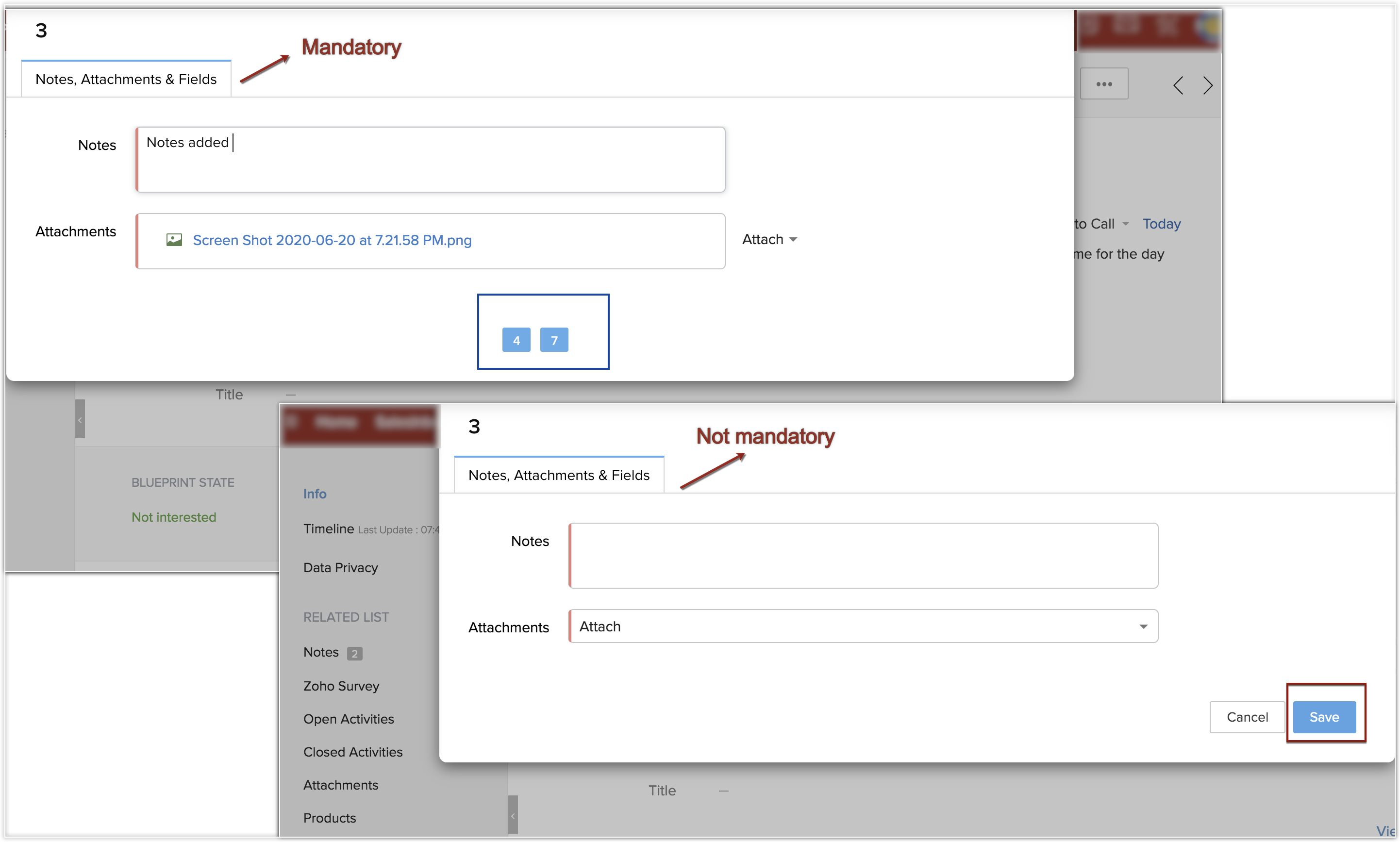 If a Blueprint is set as continuous and you have set the notes and attachment as mandatory, during the process, Blueprint will show the next available transition instead of the Save button.
