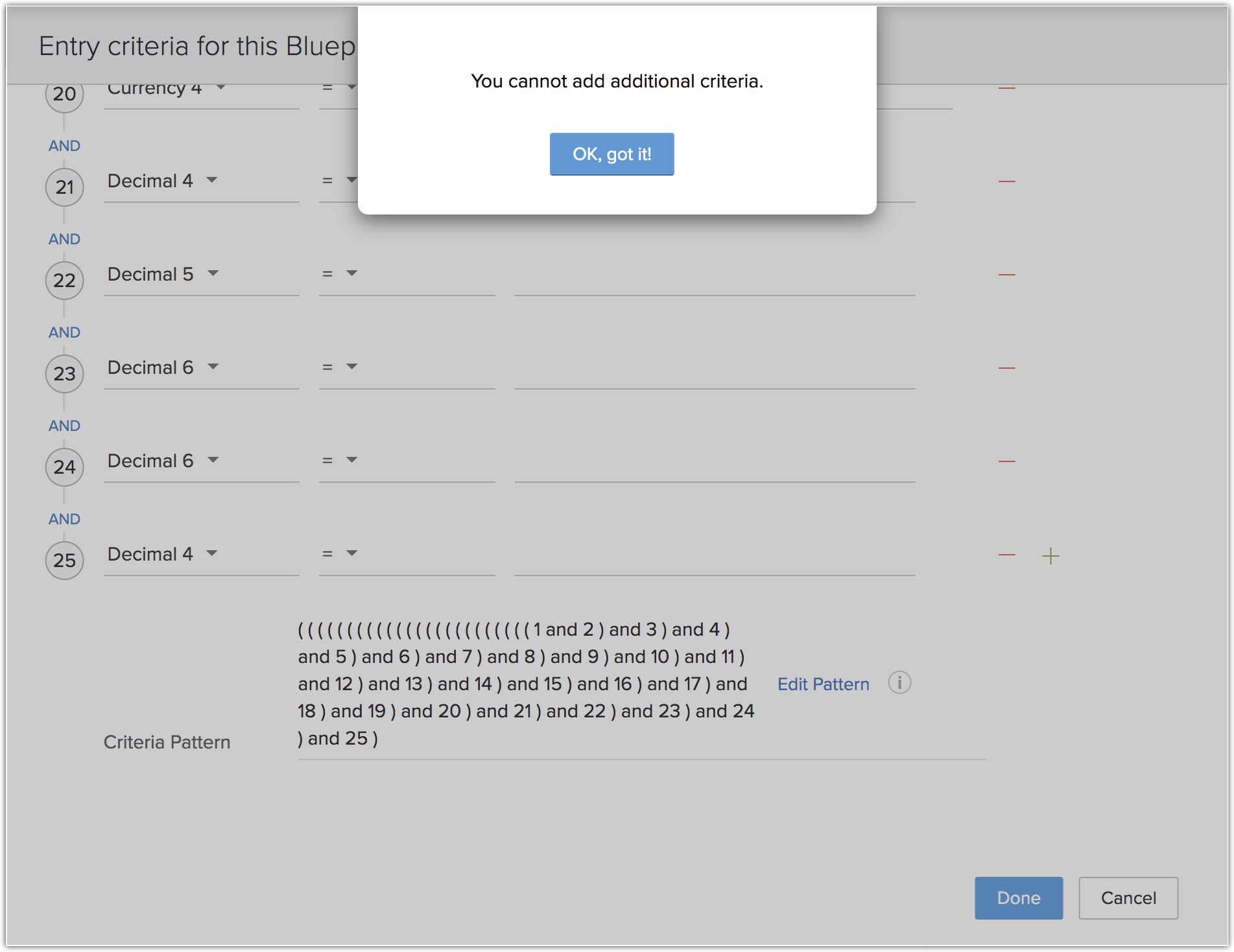 You may have reached the maximum limit for criteria in a Blueprint , which is 25.