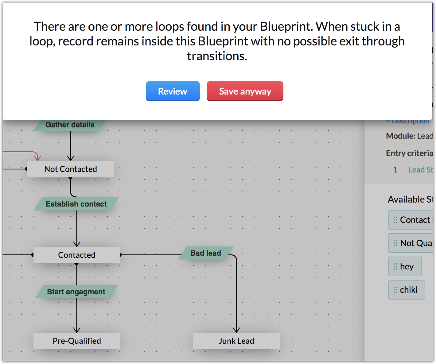This alert indicates that a record will get stuck a loop cycle going through the same transitions over and over with no way to exit the loop in order to complete the process of the Blueprint. Click on the Review button to view and resolve the loop.
