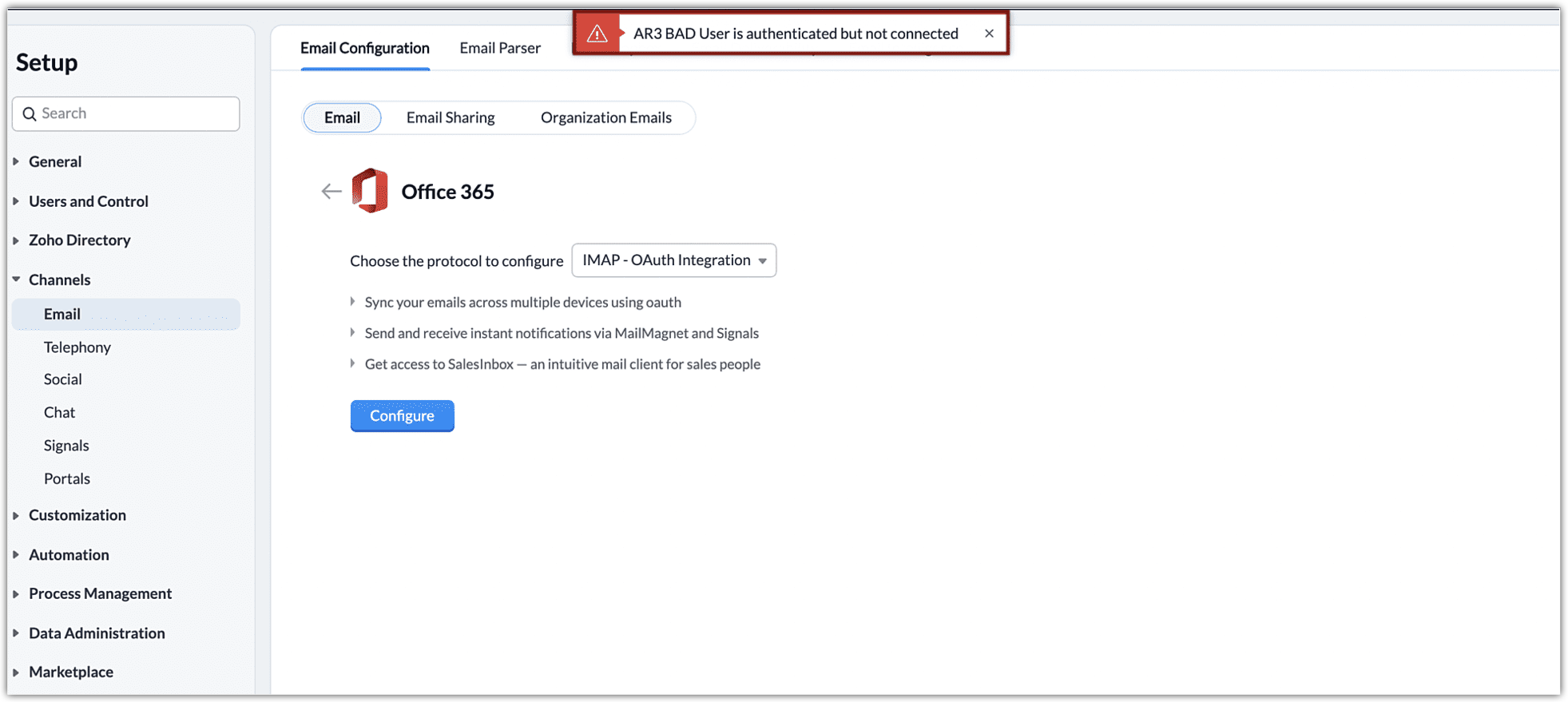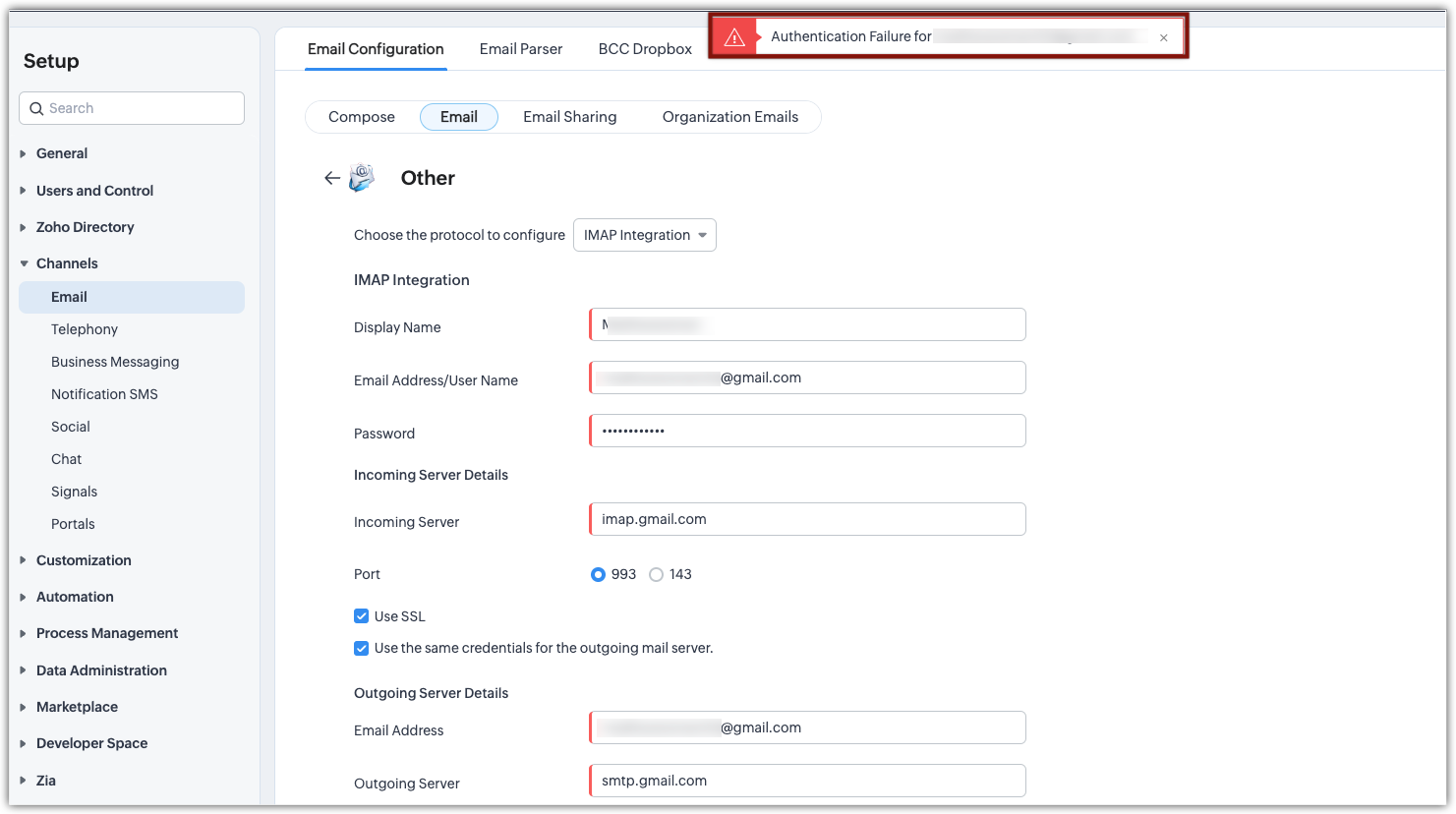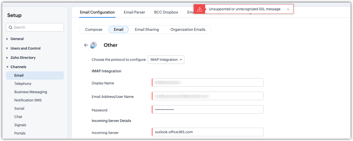 A connection error may occur when there is a port or server-related error while configuring IMAP/POP3 protocols in your CRM account.