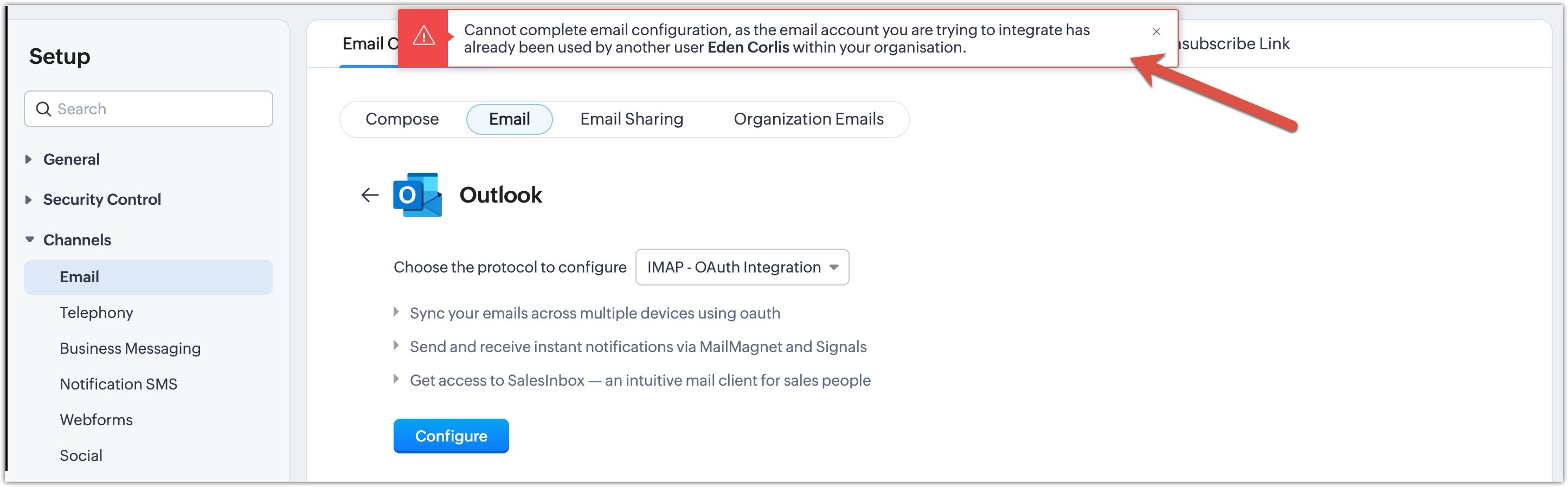 "Cannot complete email configuration as the email account you are trying to integrate has already been used by another user <<User name>> within you organization.