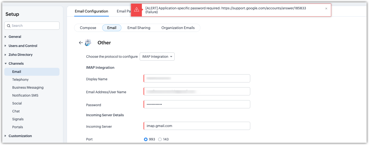During the IMAP/POP3 configuration, there is an error message that says "Authentication Failure for <email id>" or "Application specific password required"
