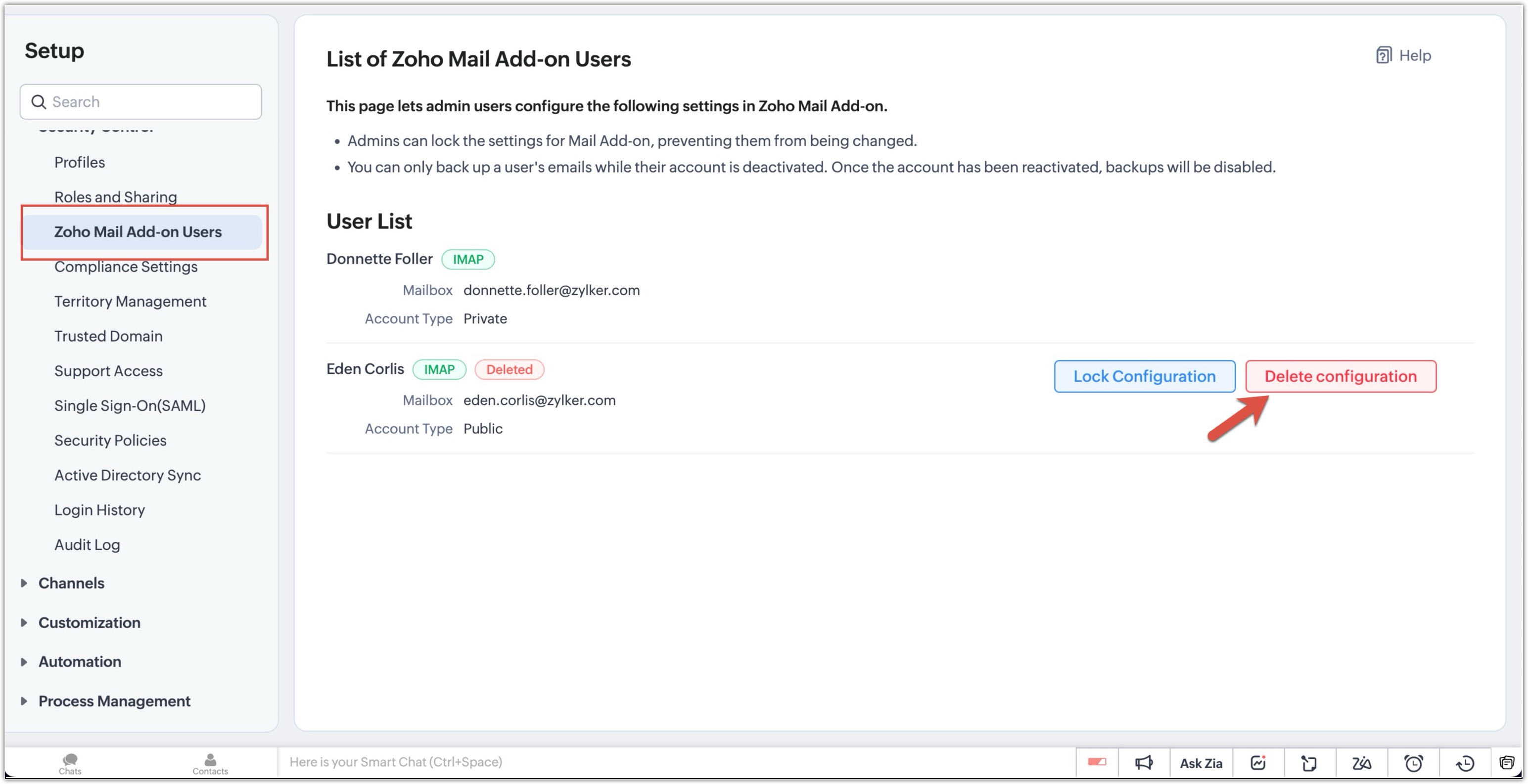 - Navigate to Setup > Users and Control > Security Control > Zoho Mail Add-on User.