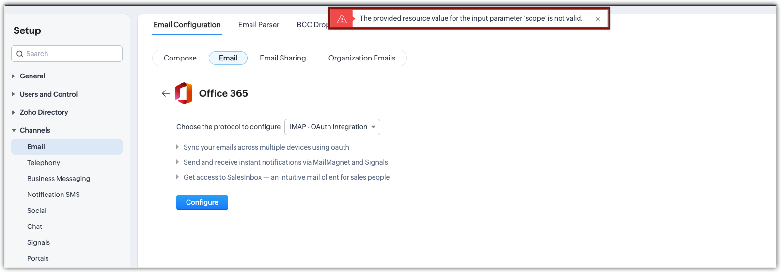 During MS Outlook or Office 365 integration via IMAP-OAUTH or POP3-OAUTH protocols, if you encounter the following errors, please follow the respective steps to resolve them.