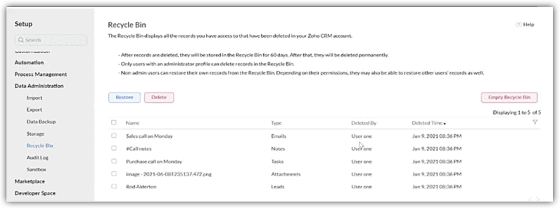 When you delete a record, all the attachments, notes, emails, and tasks associated with it will also be moved to the recycle bin, so even if you didn't delete them directly, they will appear in the recycle bin under your name. Here, you can see that the lead "Rod Alderton" was deleted at the same time, so we can assume those other items were attached to that record. If you restore the lead record, all the other items will also be restored.