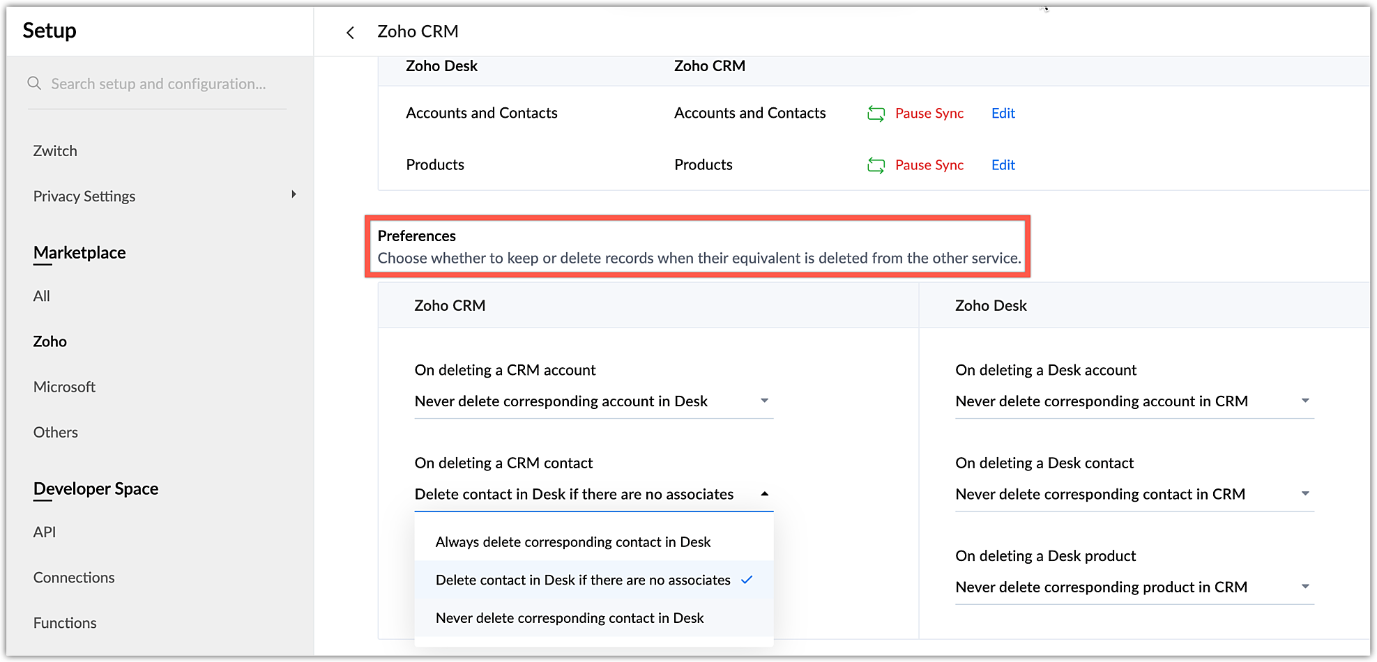 If you don't want your records to be deleted from CRM or Desk, select 'Never Delete' in the corresponding boxes.