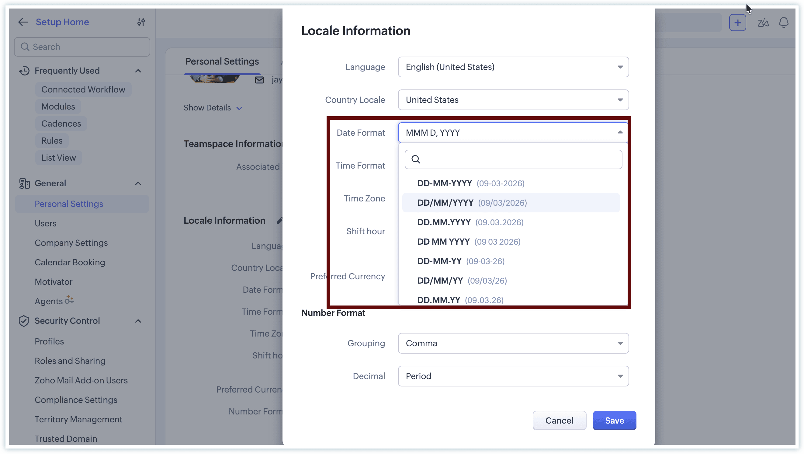 - The Settings page showing the date format set under Locale Information in Personal Settings.