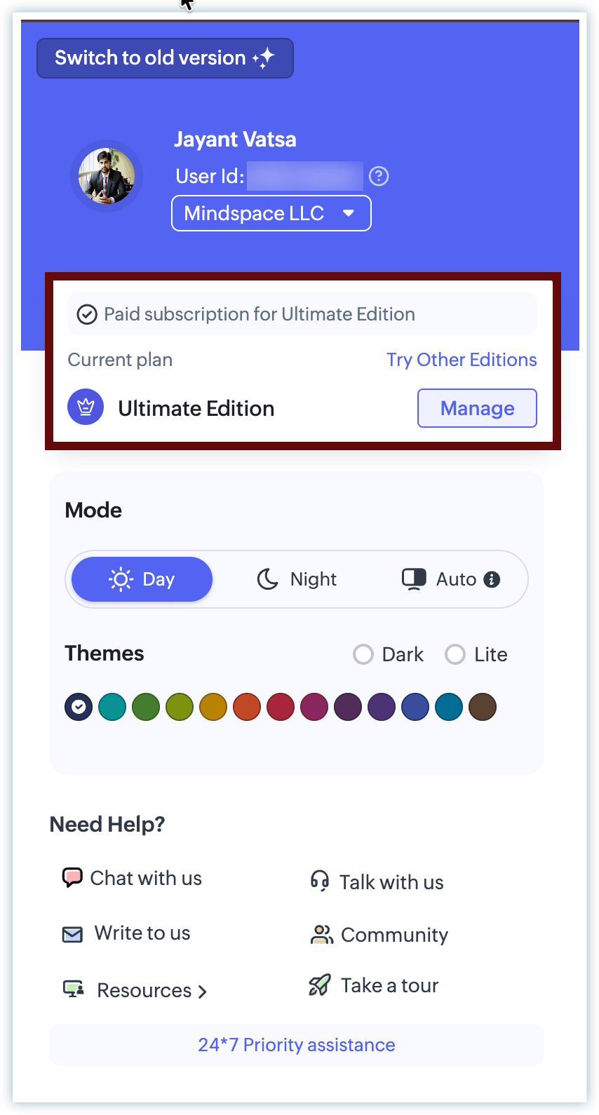 Check the number of user licenses available in your account. Click the profile picture on the screen and select