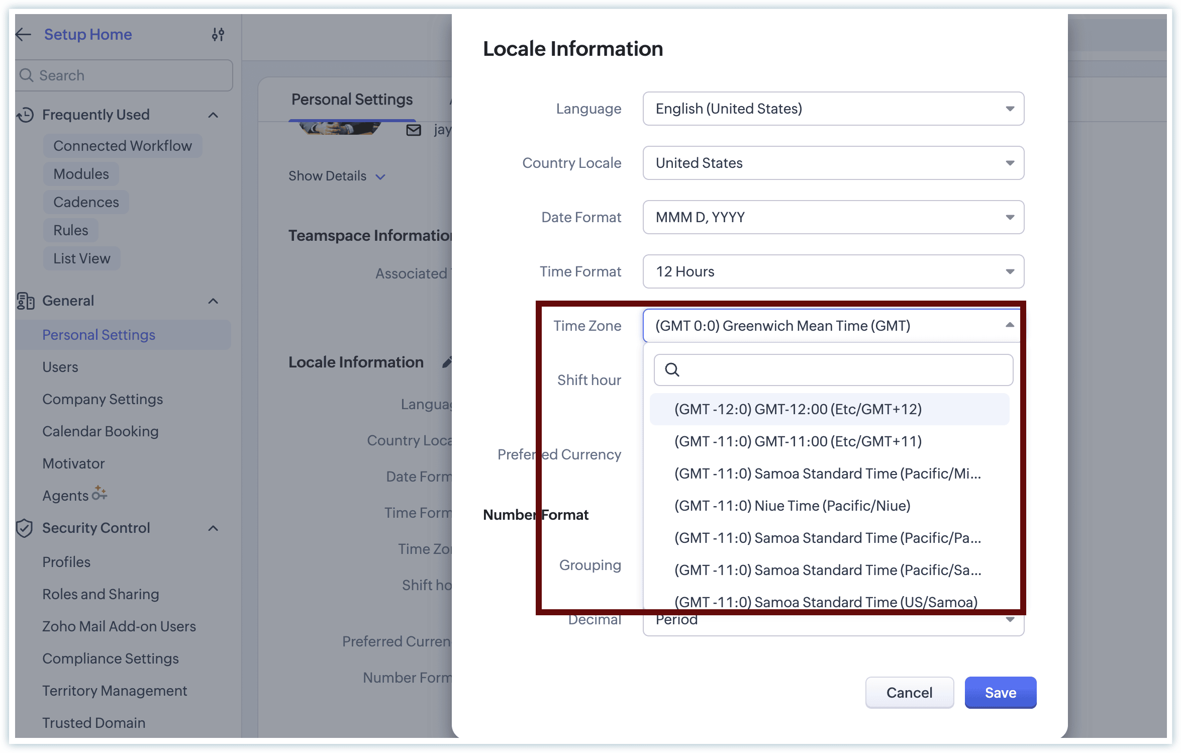 - The Settings page showing the time zone set under Locale Information in Personal Settings.