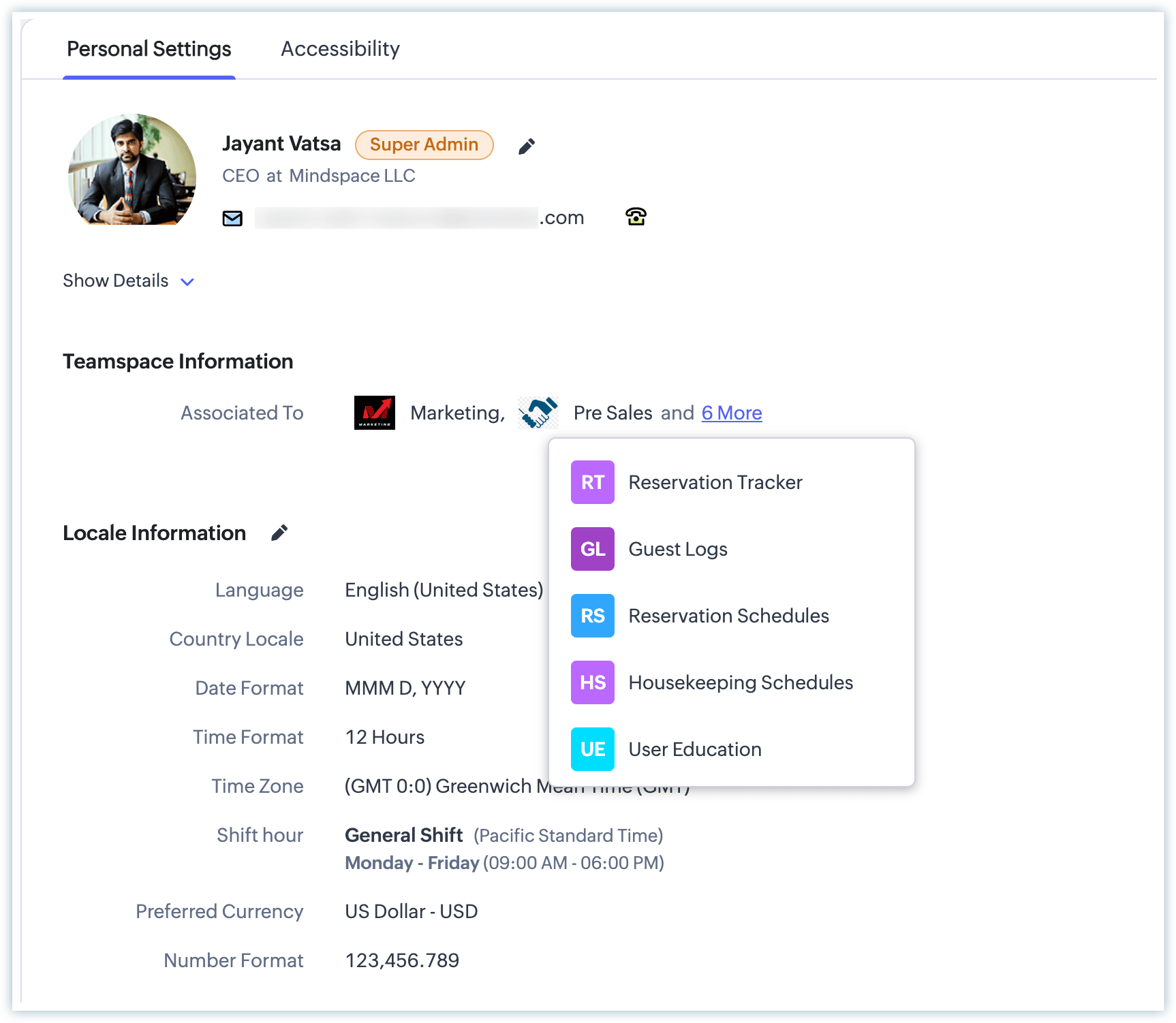 Zoho CRM provides accessibility options that allow you to customize the interface to make it more comfortable to use. These options help you adjust the system in terms of visibility and motion control.