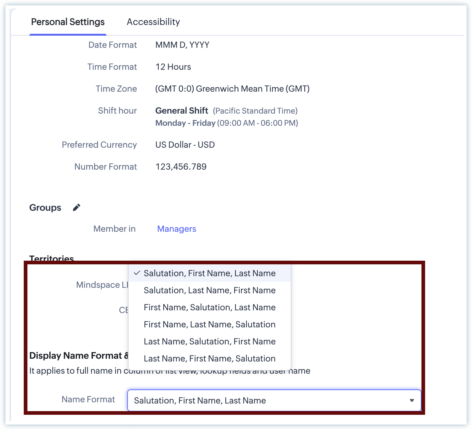 - The Settings page showing the Name Format set under Display Name Format & Preferences.
