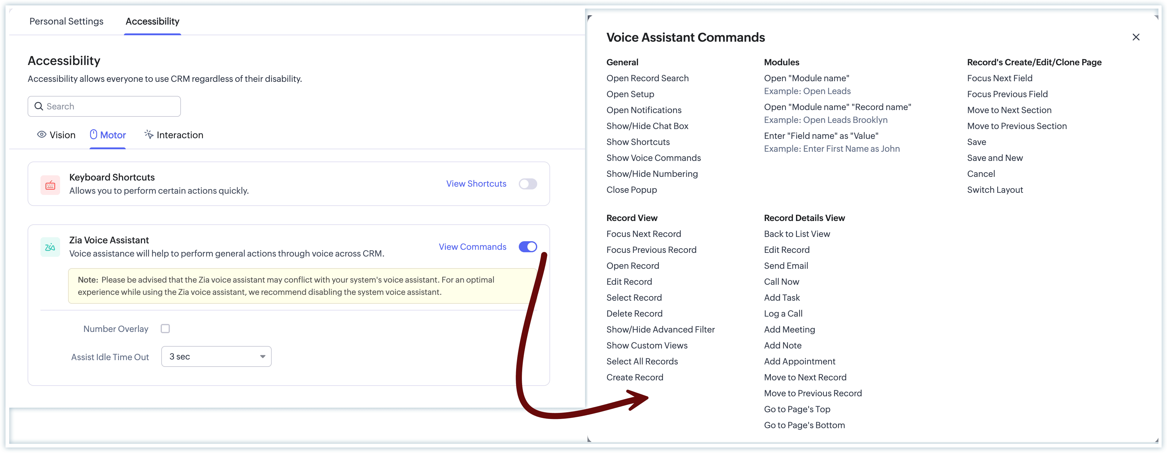 CRM Setup > General > Personal Settings > Accessibility > Zia Voice Assistant.