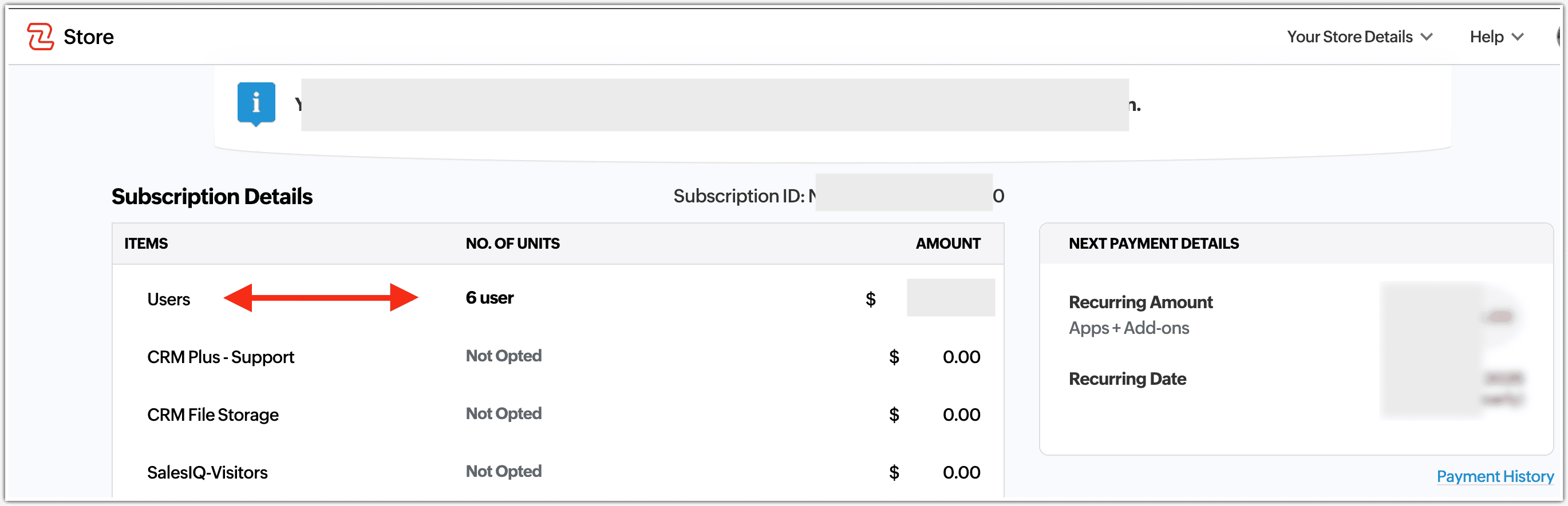 Manage Subscription. This will redirect you to the Zoho Store page, where you can view your subscription purchase details.