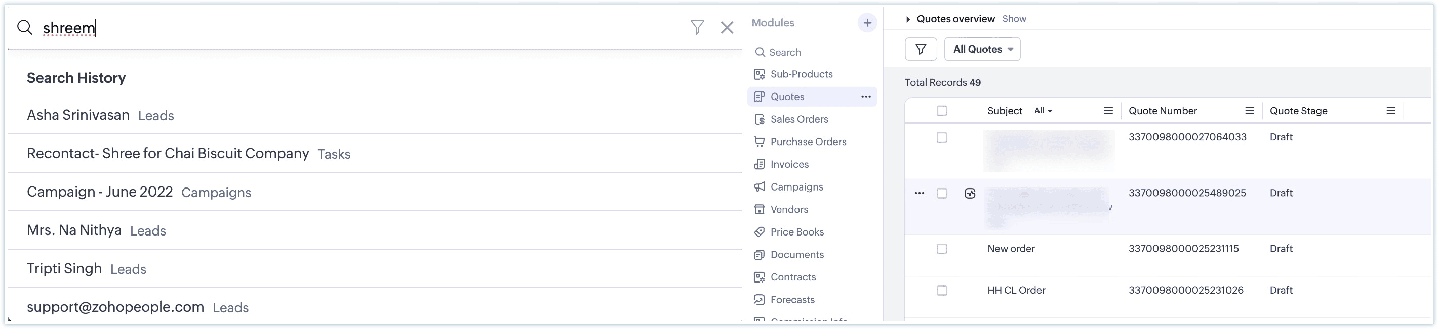 If more than 10 records match the search term, the results will be displayed based on the last activity or modified time.
