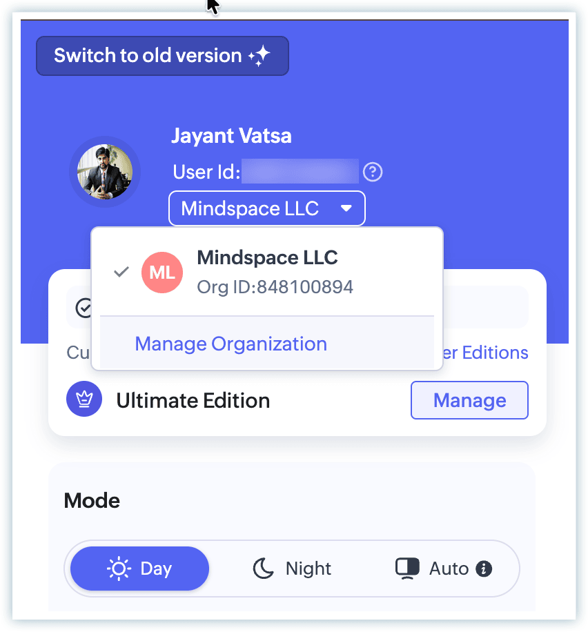 To switch between organizations, click on the profile picture icon, then click the drop-down menu next to the Organization Name and select Manage Organization to access the alternate organization account.