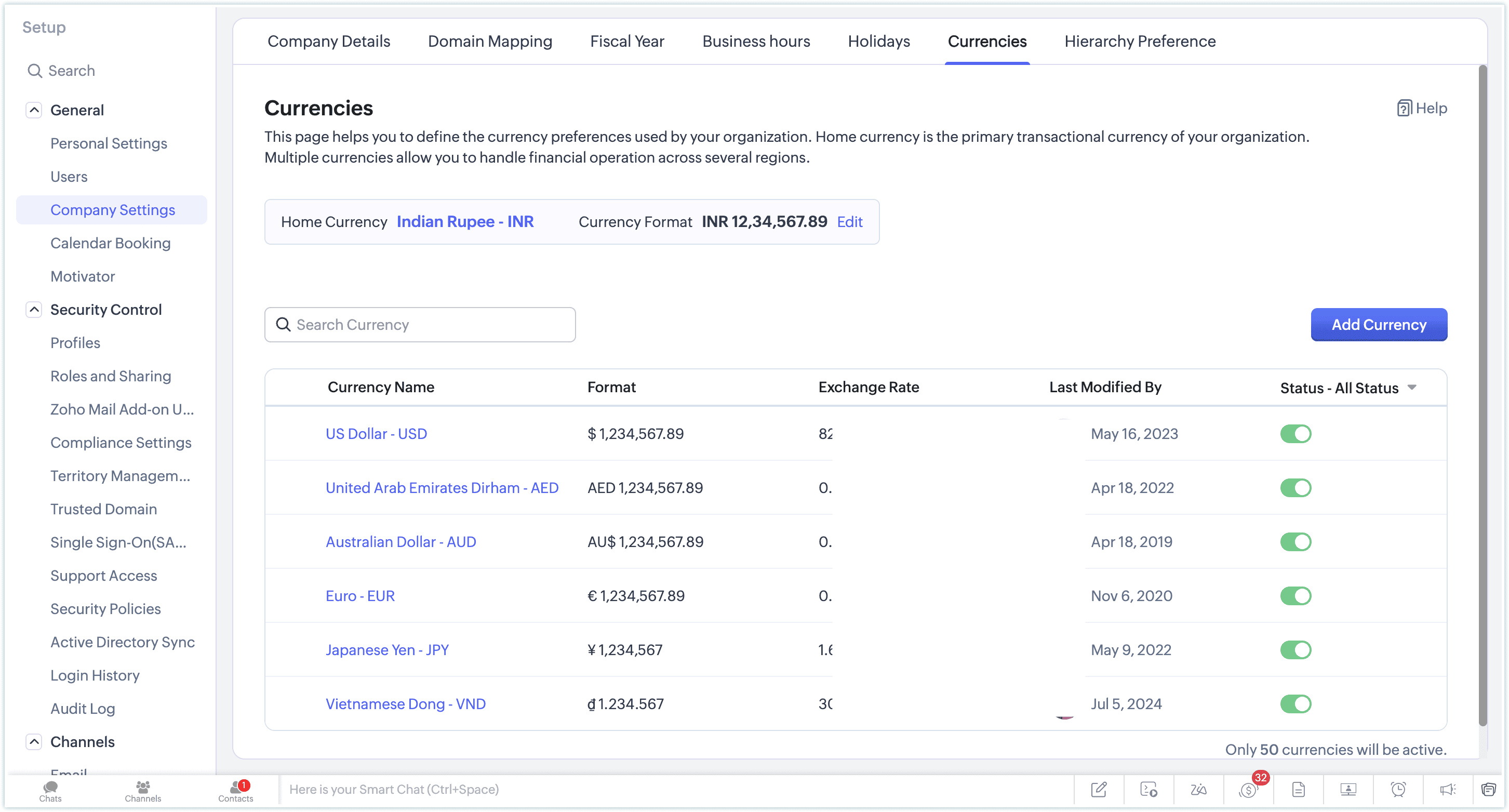 First, verify whether a home currency has already been set in your account. To check this, navigate to Setup > General > Company Details > Currencies.