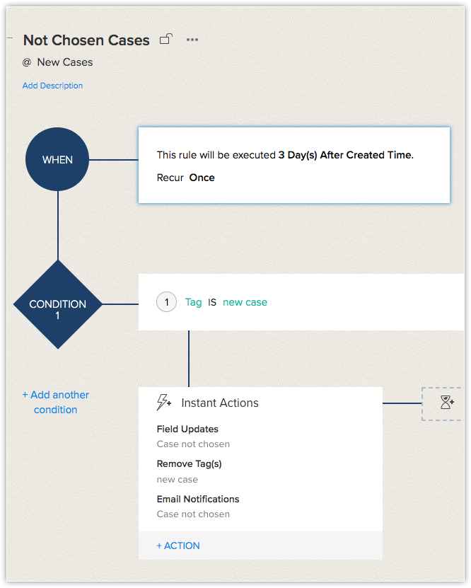 Some cases are not chosen by any of the attorneys. To review and close these cases, Leotta has set up a workflow rule that is triggered 3 days after a case is added to the New Cases module and triggers the following actions: