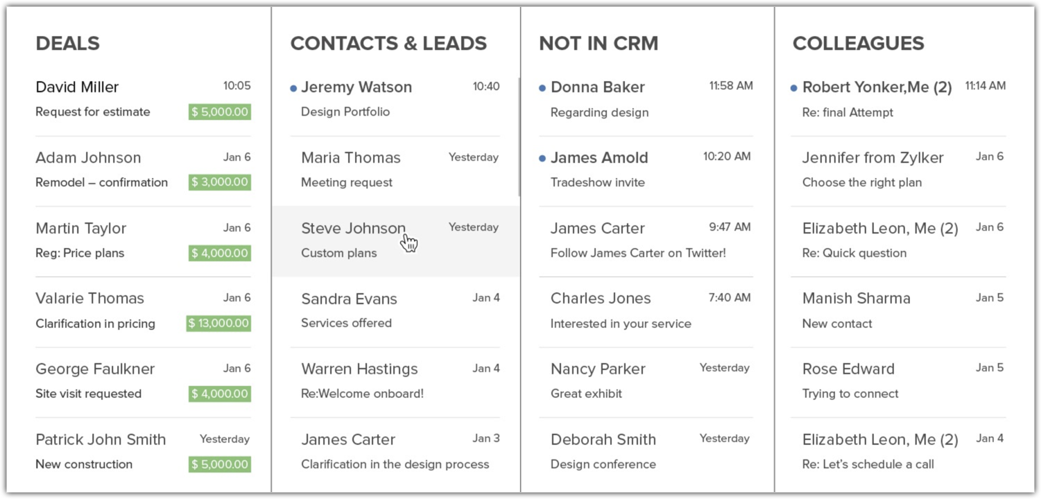 Since most of inbound and outbound communication happens over emails, the reps use SalesInbox for better email management. This keeps their inboxes well-organized with incoming emails categorized into different columns: Leads, Designers, Colleagues, and Not in CRM. They quickly prioritze the emails by checking the sentiment analysis of the emails. They also use the AutoResponse feature to set reminders to follow up again if a lead hasn't replied to their email.