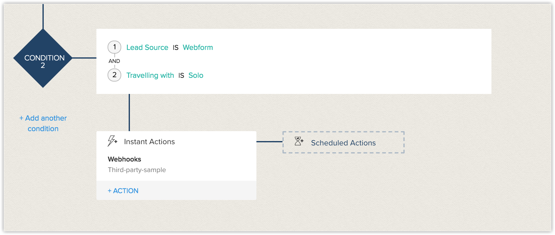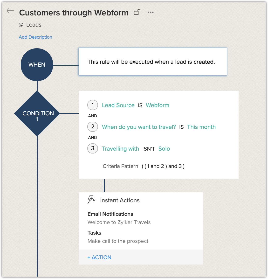 - Condition 1: They want to send welcome emails immediately to those customers who have chosen the travelling month as current month and are not travelling solo. These customers must also be tagged as high priority, so the reps can promptly tend to their queries. Also, the reps should make a call to the prospects soon after the webform is submitted.