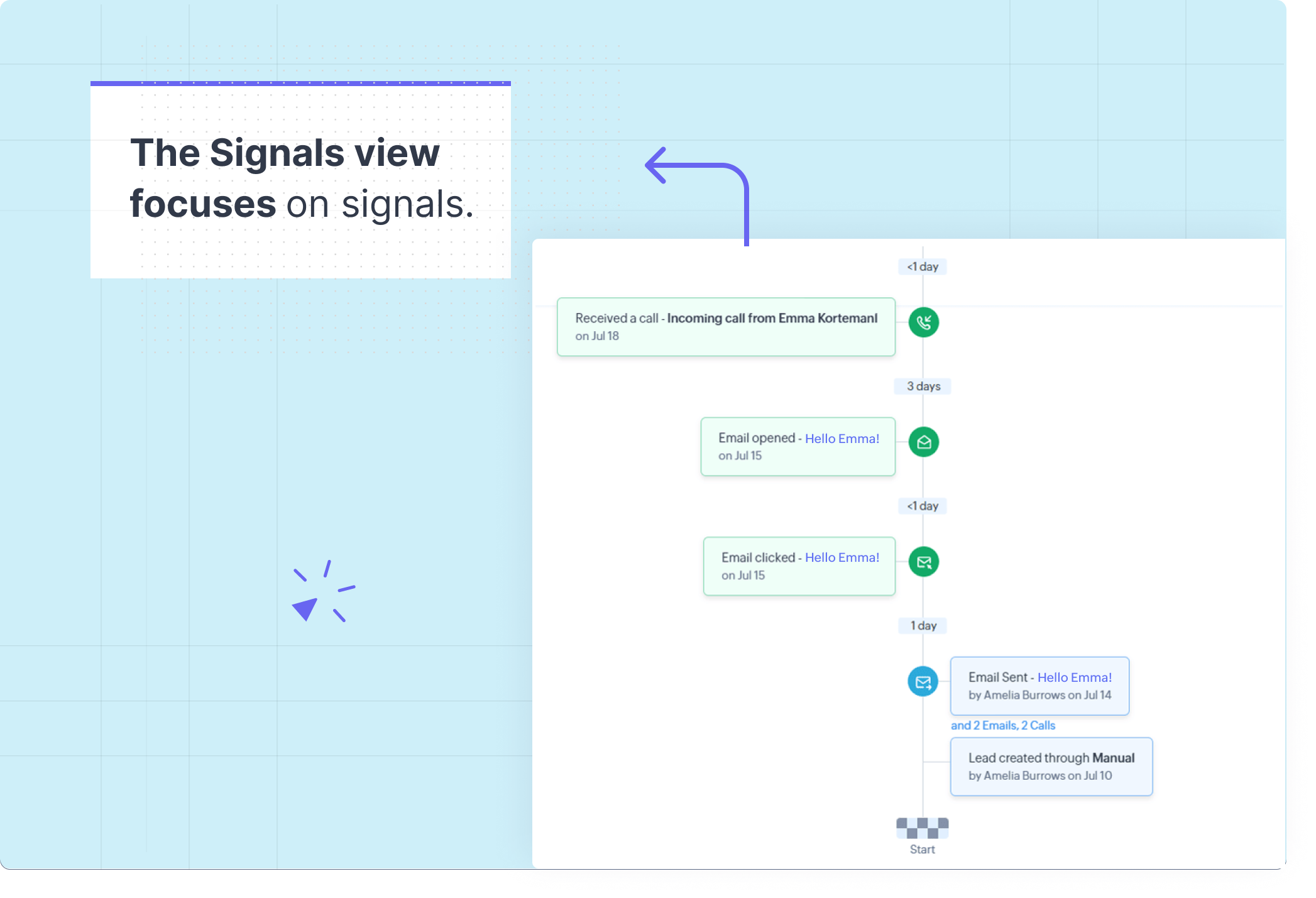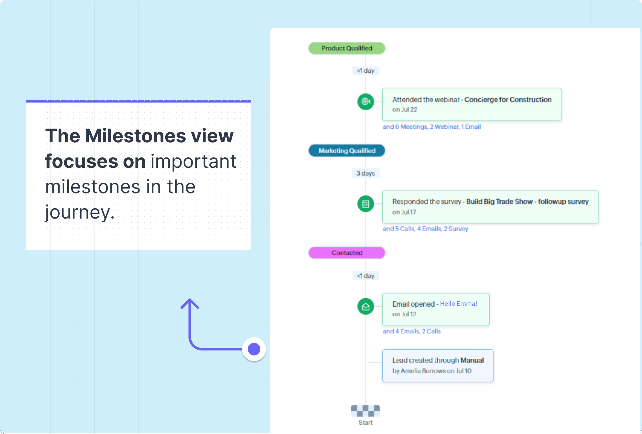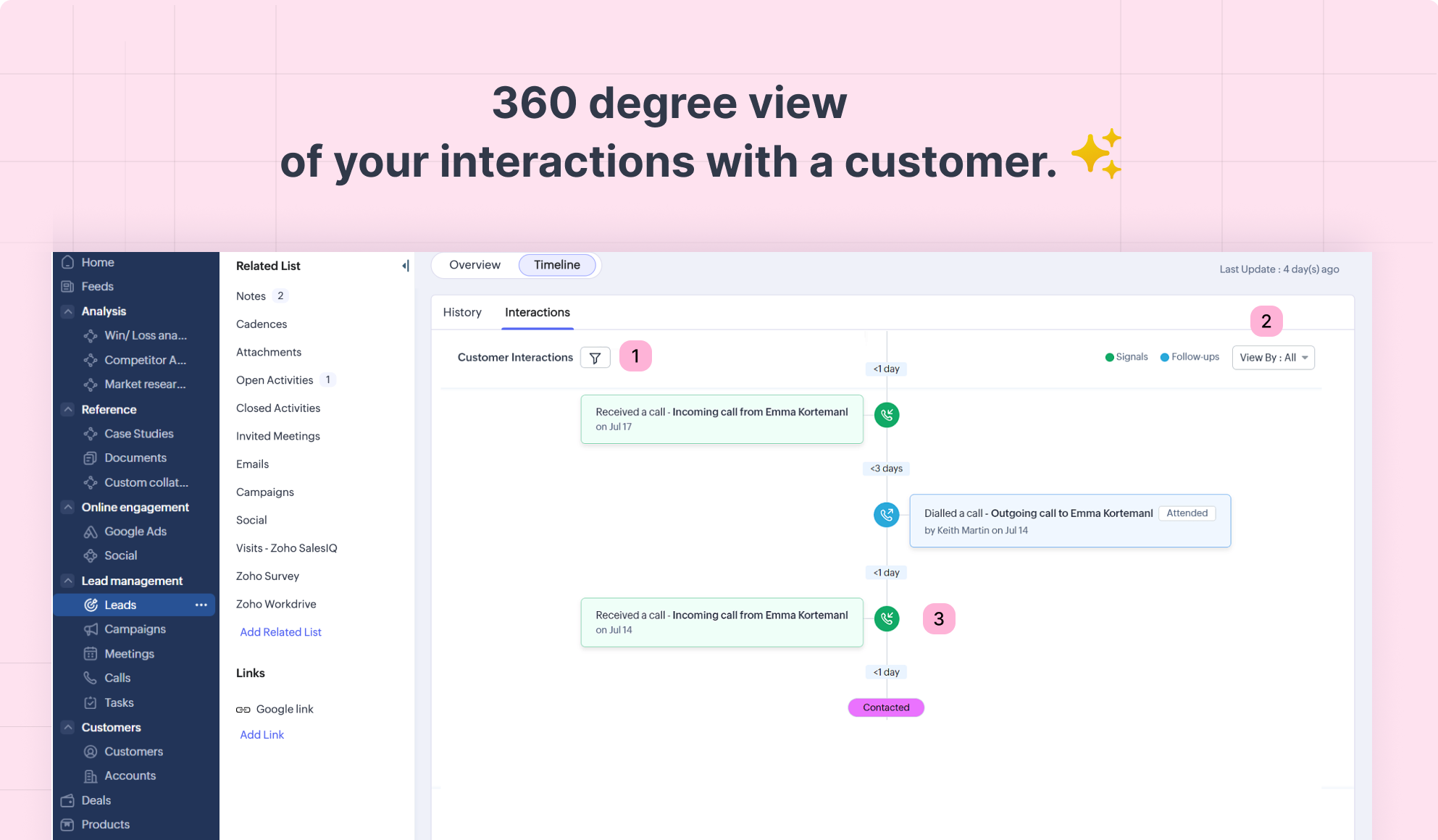 - Get a complete overview of a customer's ongoing journey, from the moment they were added as a lead or contact in the CRM.