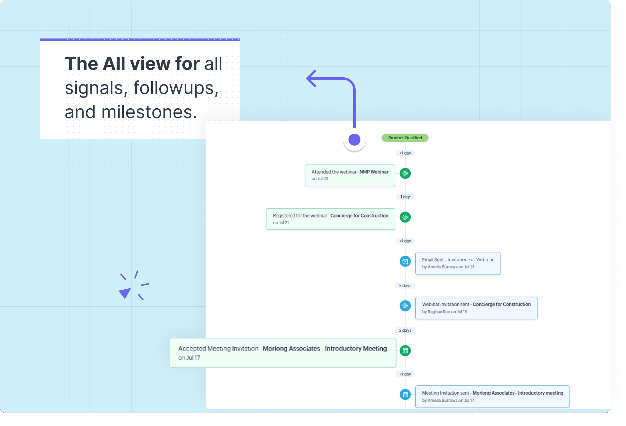 Along with signals, the touchpoints in your customer's journey include followups. These are interactions initiated by the CRM users in your organization. They include information about the CRM user who initiated/responded as well as the date on which the followup happened. You can view the exact time of the followup by hovering over the date in the followup. They are arranged on the right side of the trail.
