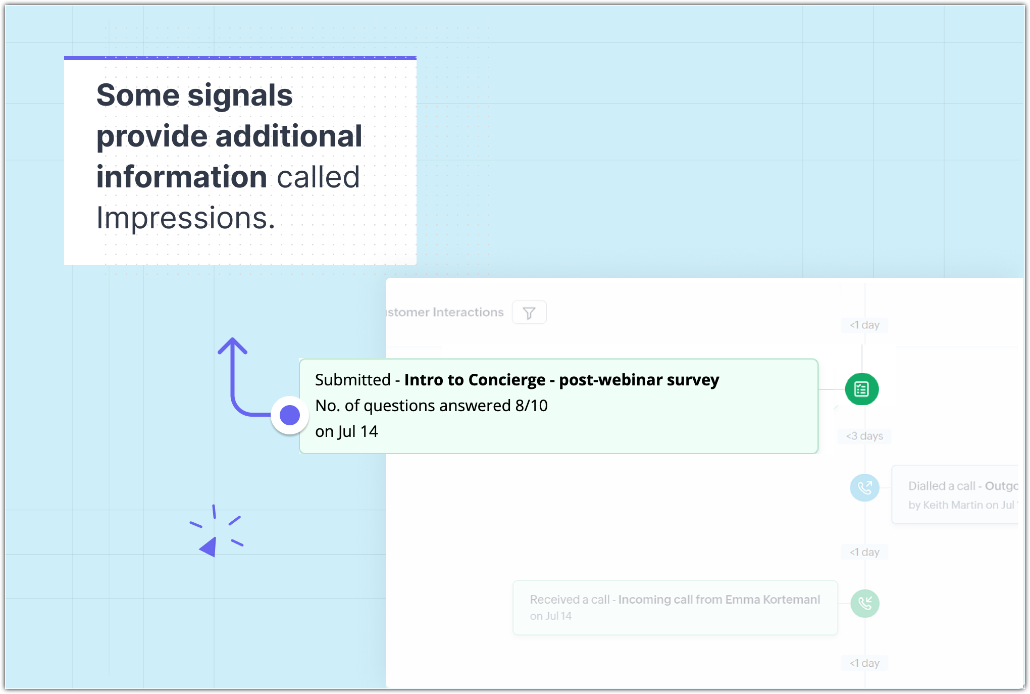 These are provided by the customer across multiple mediums. Examples include opening an email, making a call, visiting a website, and so on. Signals are present on the left side of the trail.