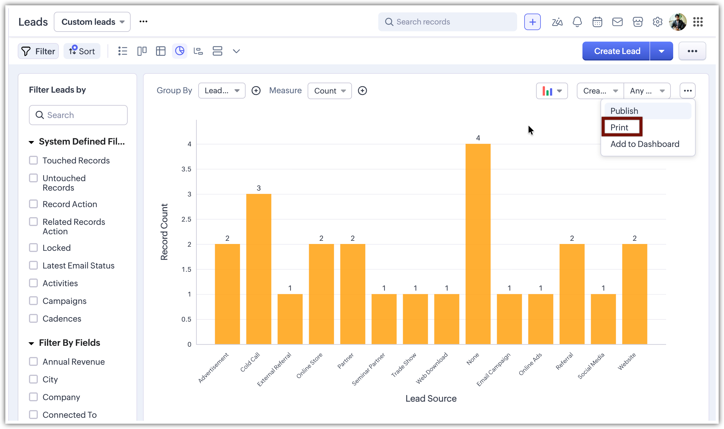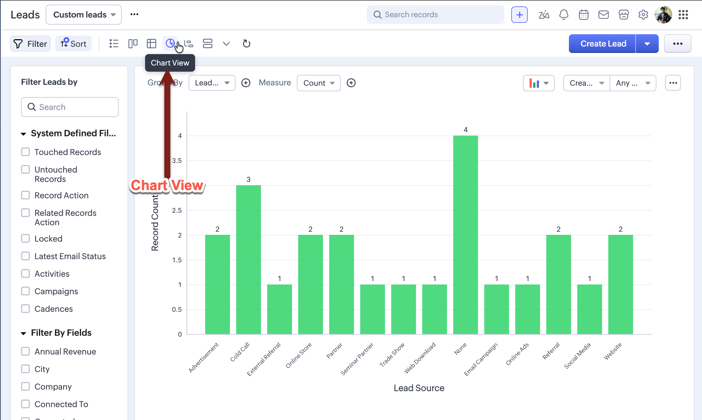 Chart view presents data visually using formats like pie charts, bar charts, column charts, donut charts, and more. This feature allows you to see your records in various chart types and apply filters to narrow down the data according to your needs by transforming raw data into intuitive charts. This feature improves decision-making, identifies patterns and trends, and optimizes sales strategies within your CRM modules. This eliminates the need for moving into CRM's analytics suite for simple visualization needs.