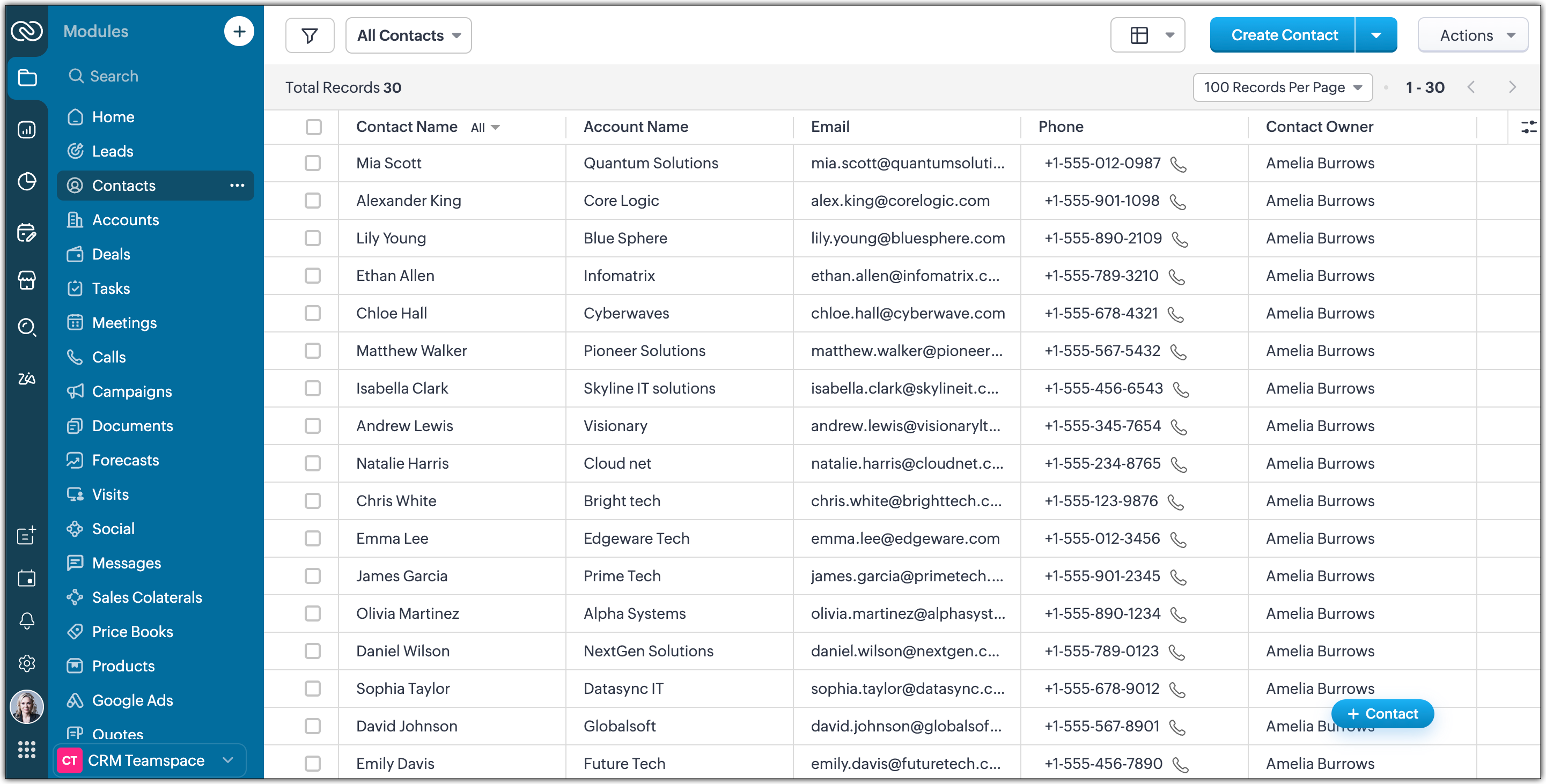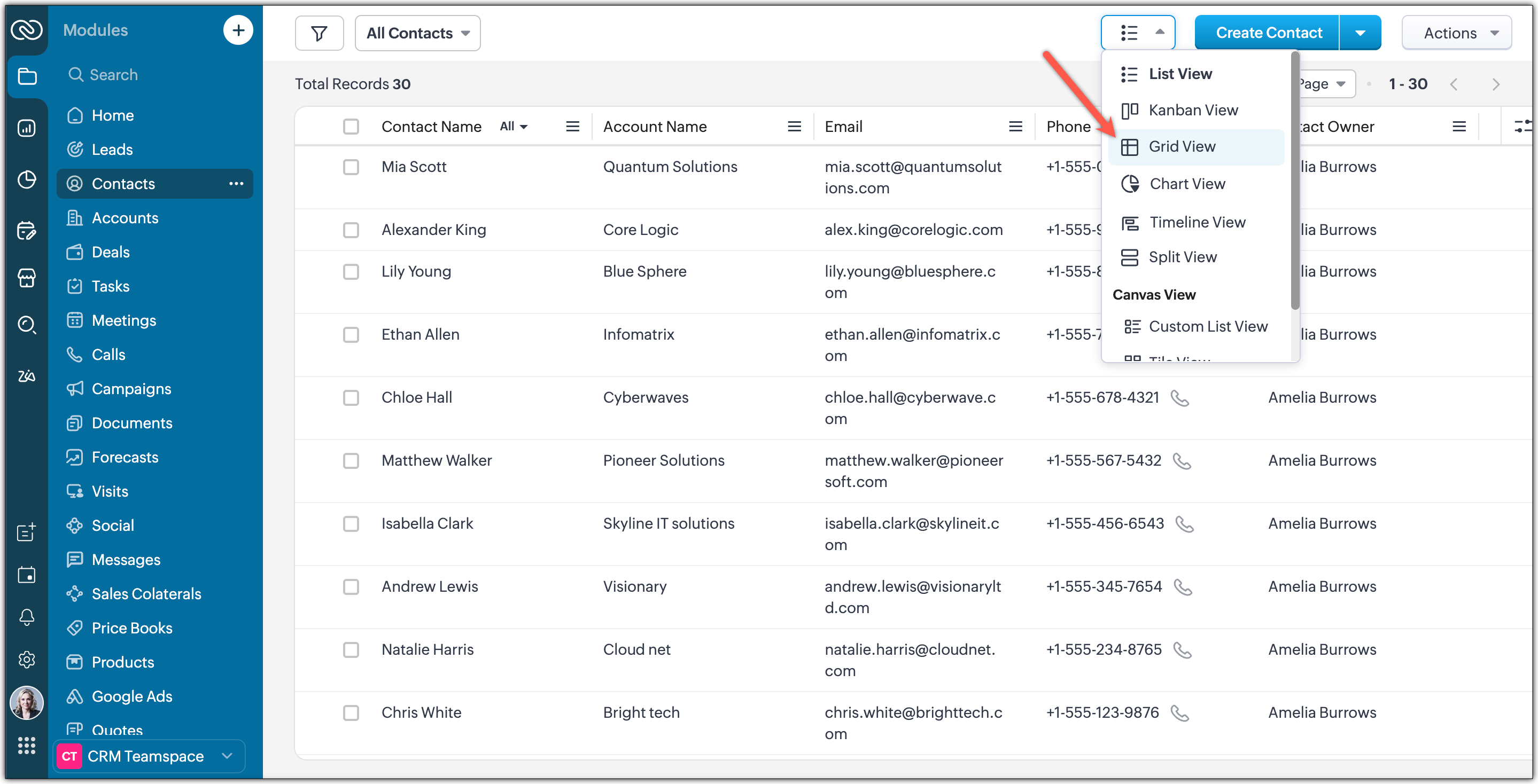 Zoho CRM's grid view allows users to view module data in the form of a sheet. This feature provides a spreadsheet-like interface for managing and viewing your records. With this feature, you can: