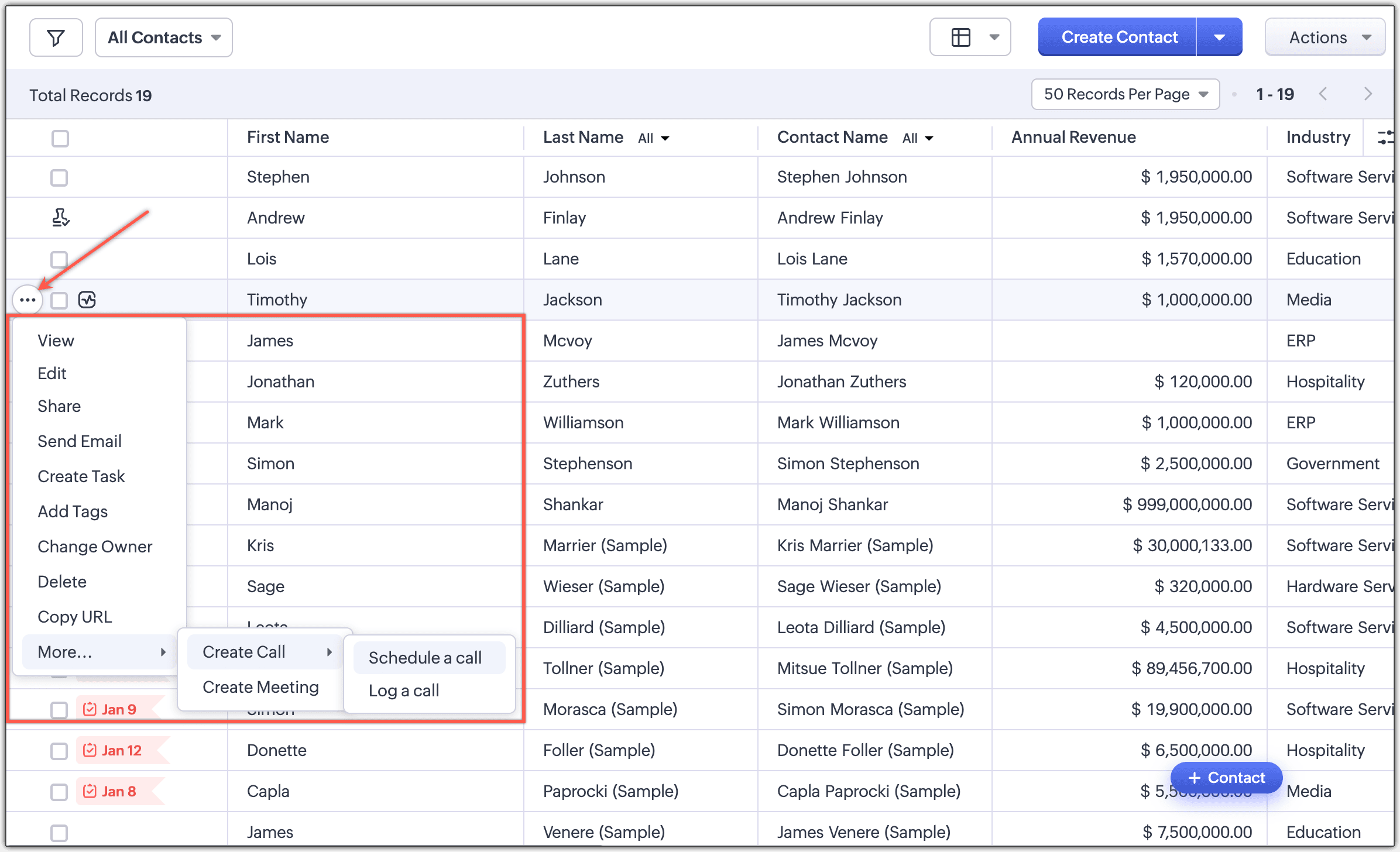 You can also perform various other actions like send email, create task, add tags, delete and more. To perform the above actions, simply click the (...) more icon that appears while hovering on a record, select and complete the action.