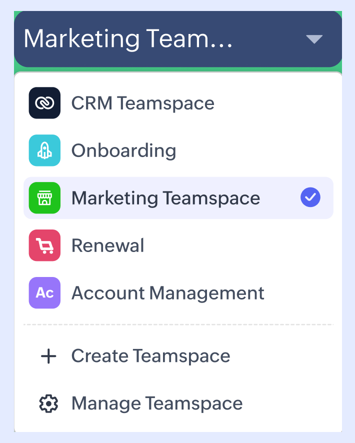 Access to a Teamspace can be managed by teamspace admins to restrict unauthorized users from viewing the data. The organization modules visible in the teamspace will be based on your profile permissions set by CRM admins. Your access to team modules within the teamspace will be determined by your profile in each specific team module as assigned by the admin of that module. In short, everyone will have access to the data they require, no more and no less.