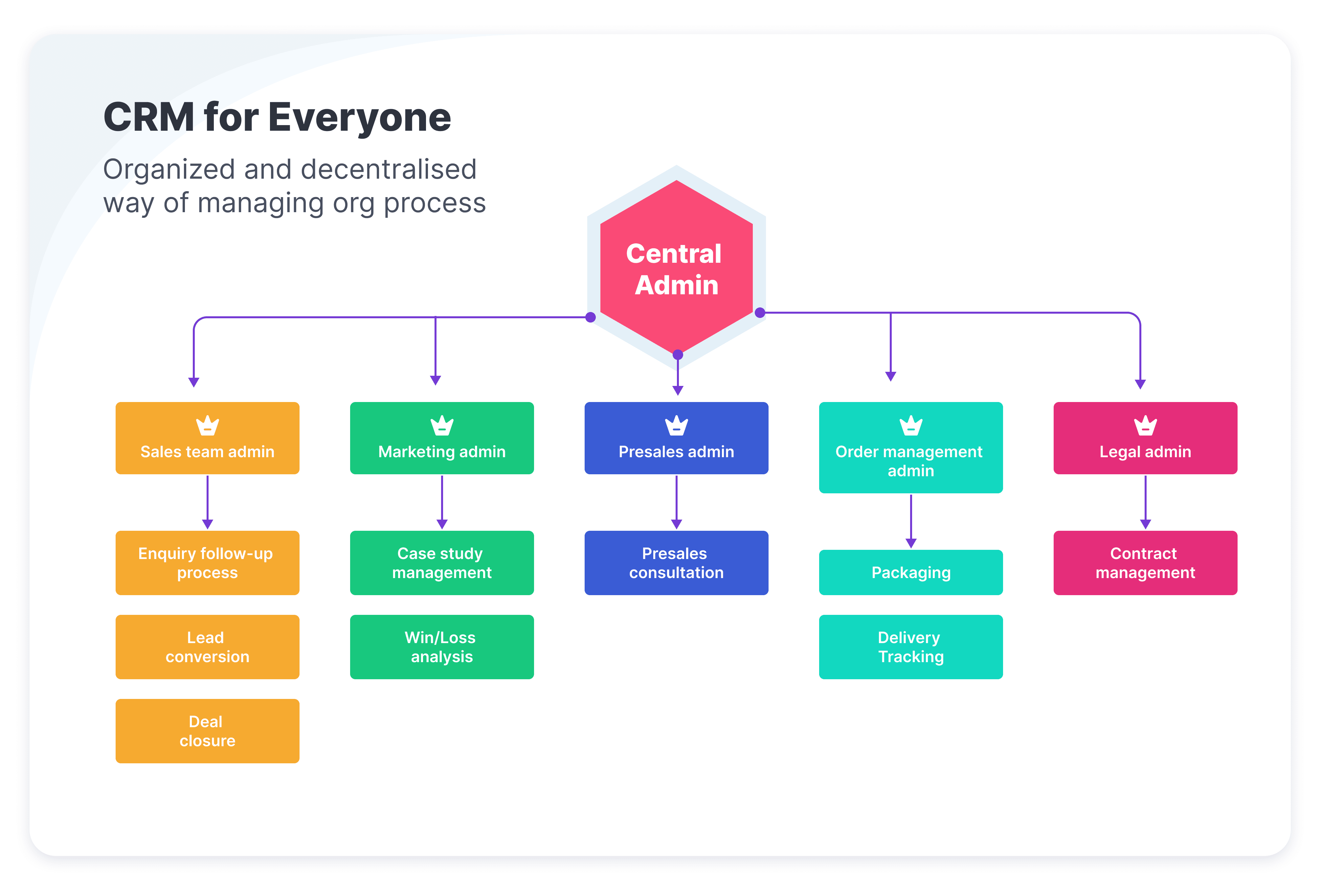 CRM for Everyone is a single platform for end-to-end collaboration among multiple teams involved in customer-related workflows. It is designed to help your sales teams coordinate work with other teams in order to provide smooth, fast, and coherent experiences to your customers.