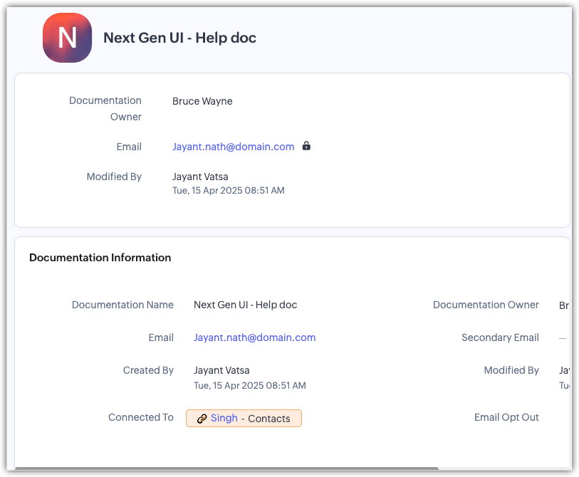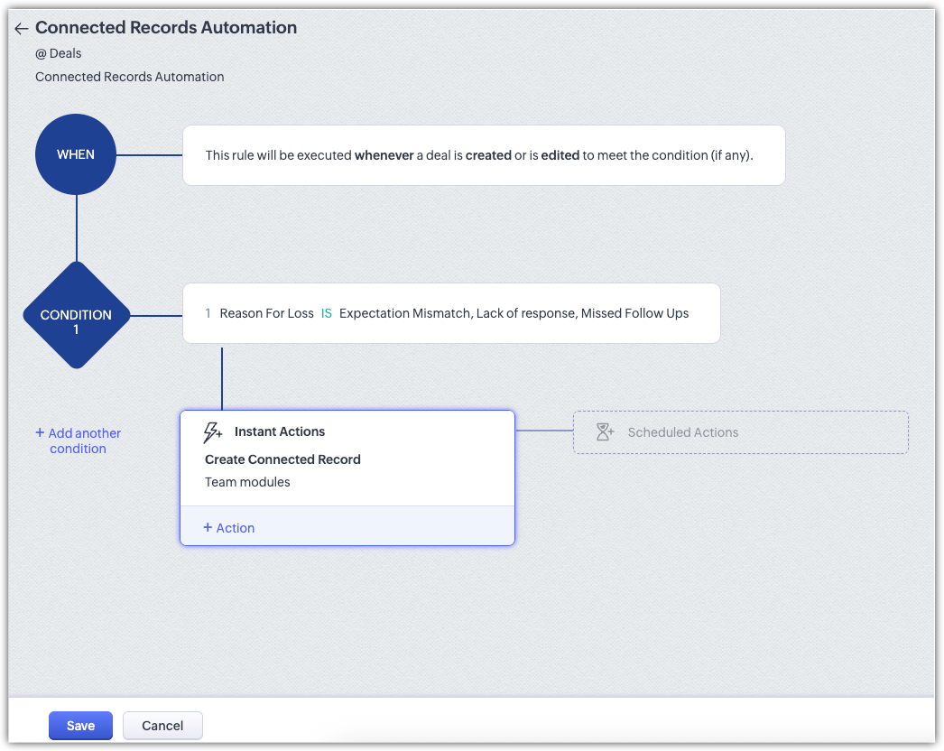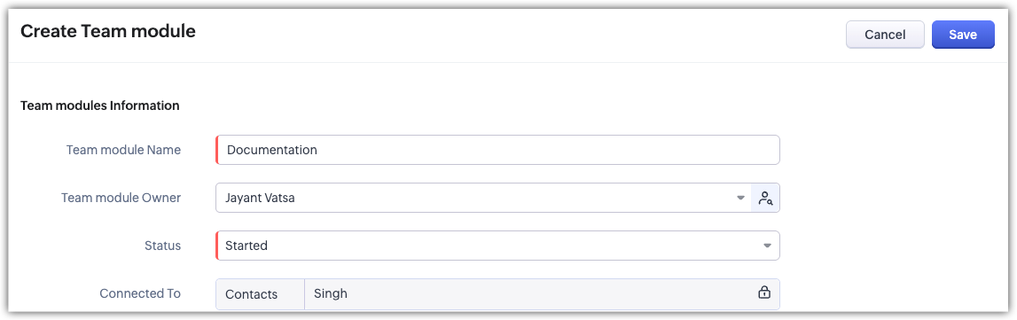 Unlike lookup fields, which require predefined relationships, it's not feasible to establish fixed connections for every module you might need. This is where Connected Records come in. When you add a module using Connected Records, a relationship is automatically created from the module where the connection is initiated. Currently, only Team modules are supported in the Add Connected Record option.