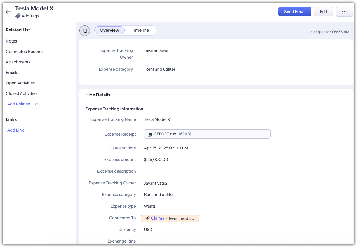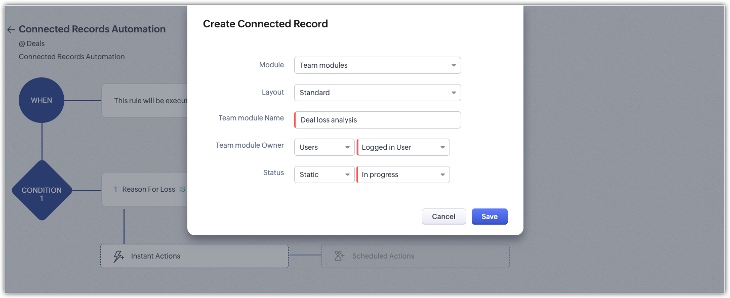 Connected Records allow you to seamlessly link modules, enabling a unified view of interactions and relationships between records. By bridging the gap between Team modules and Organization modules, this feature helps you: