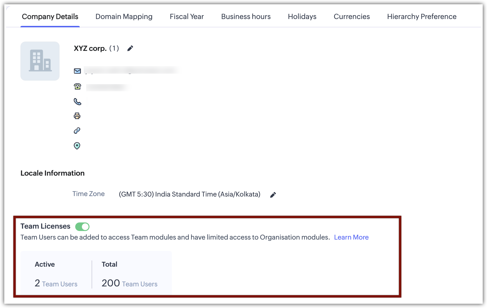 - Once the purchase is complete, you can see the number of licenses purchased by going to Company Settings and then Team User License.