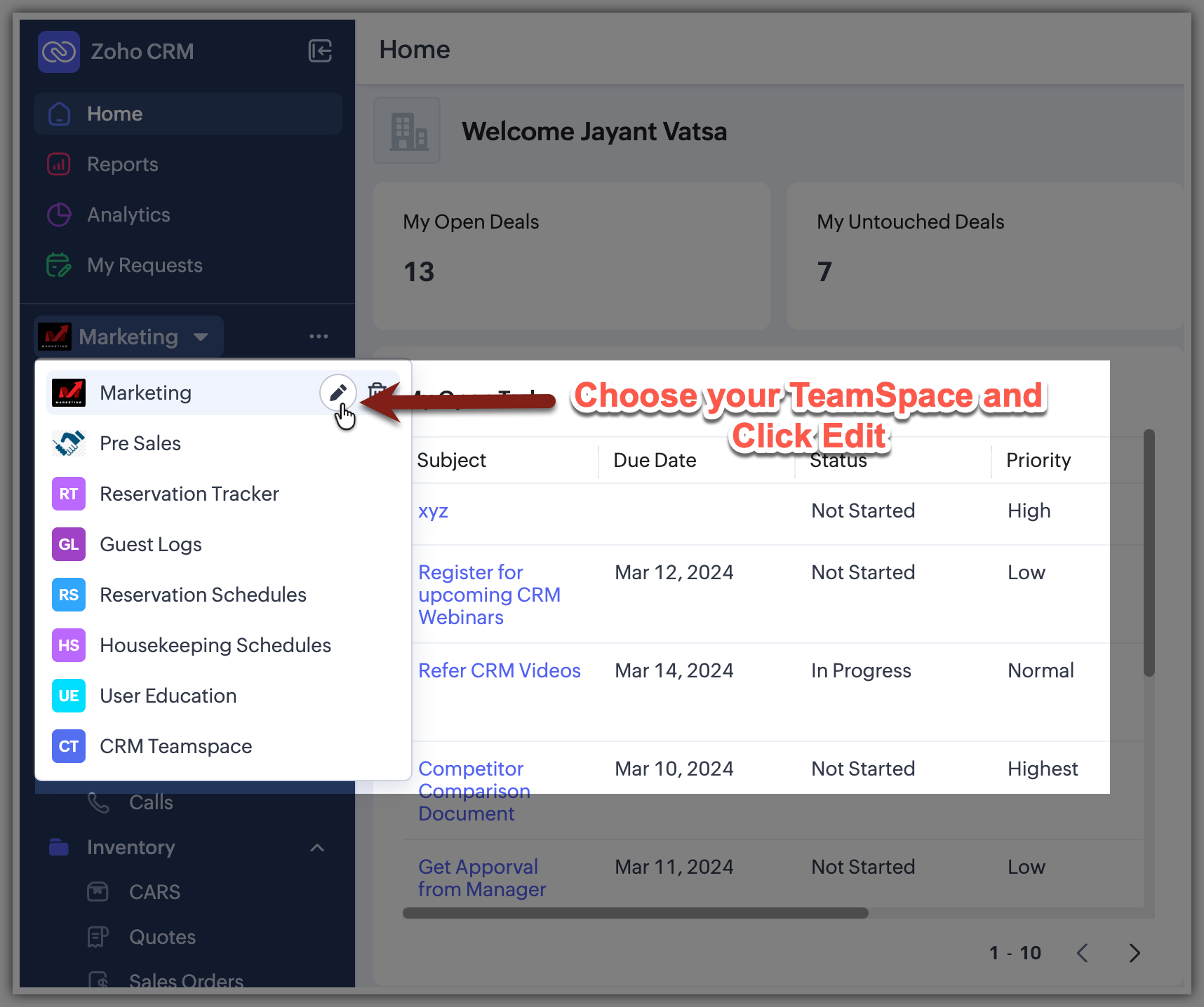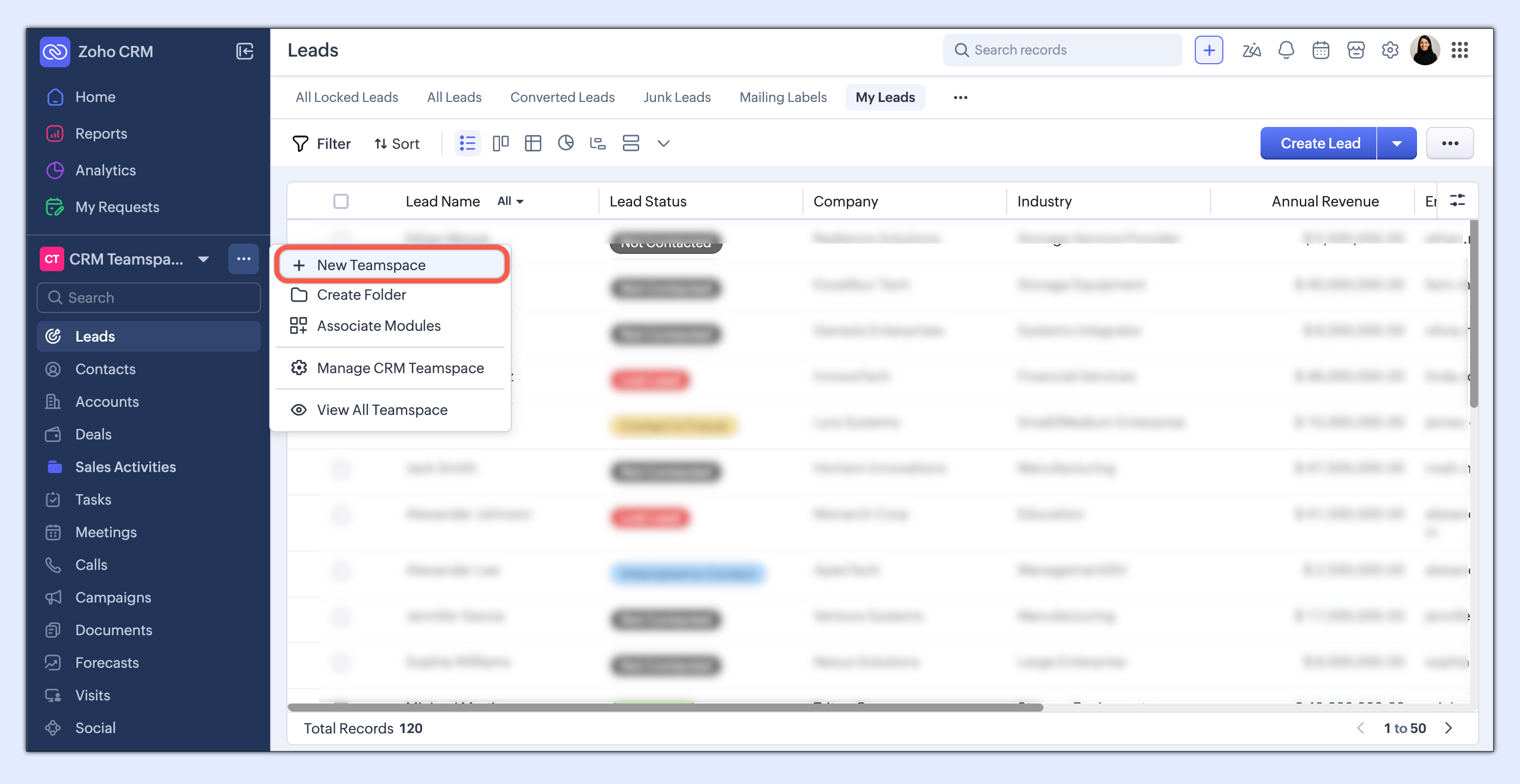 Teamspaces in Zoho CRM serve as specialized areas where teams can operate and collaborate effectively. Imagine a business as a large building, within which each department—like Sales, Marketing, or Customer Support—has its own dedicated office space. These office spaces are akin to teamspaces in Zoho CRM, designed to support the unique needs of each team within a single CRM organization. This setup allows for customization based on various criteria such as department functions, geographic locations, or specific projects.