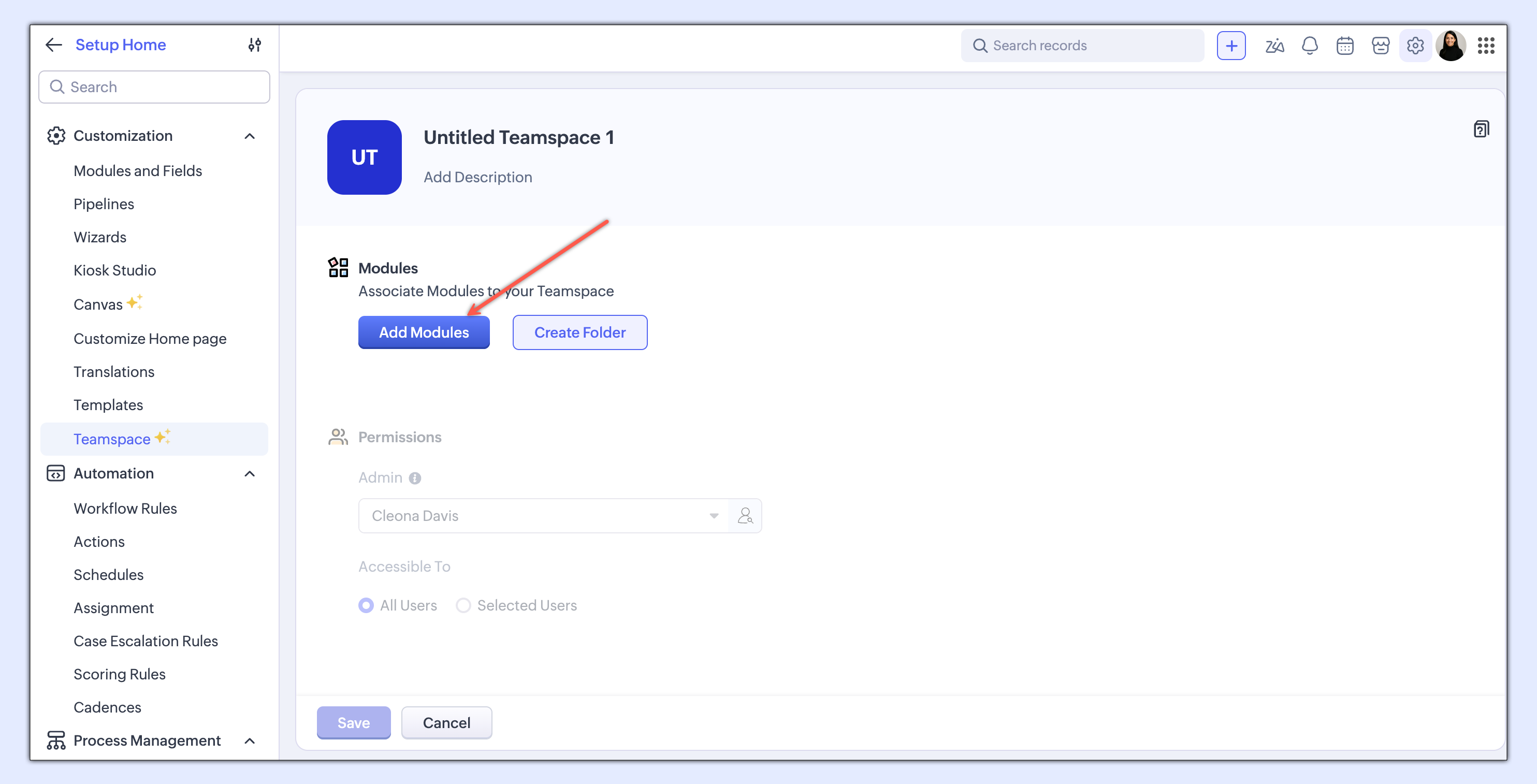 Note: While removing modules and deleting the folder, please note your Teamspace cannot be created without any modules. Make sure to add modules to your Teamspace and save for it to function effectively.