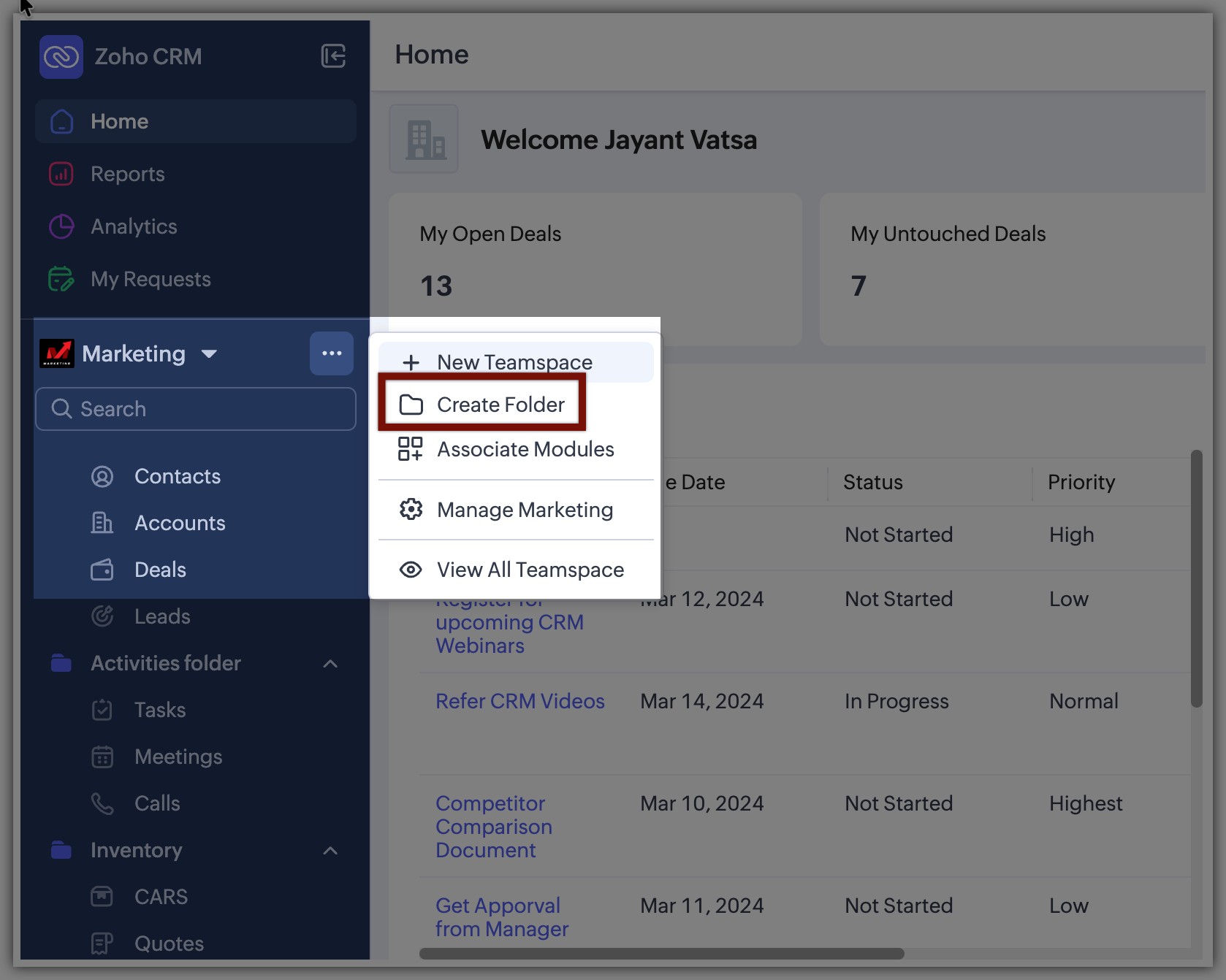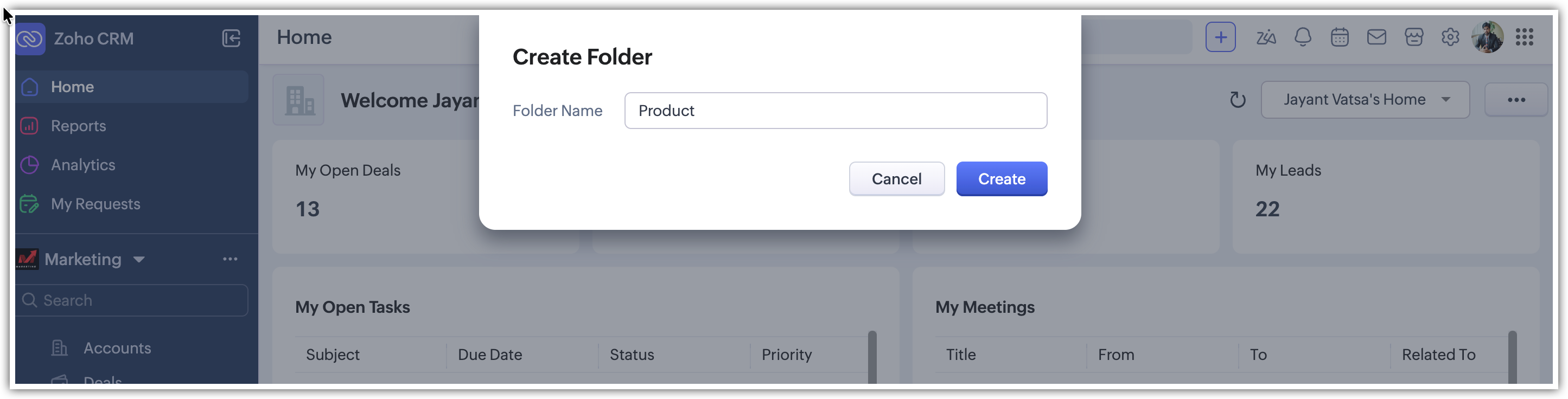 You can create folders from the modules tab in the sidebar of your CRM account. To create folders: