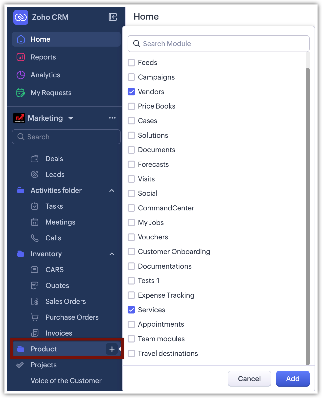 - To add more modules to your folder from the Modules tab, simply click the + icon next to the folder name, select the modules you need, and click Add.